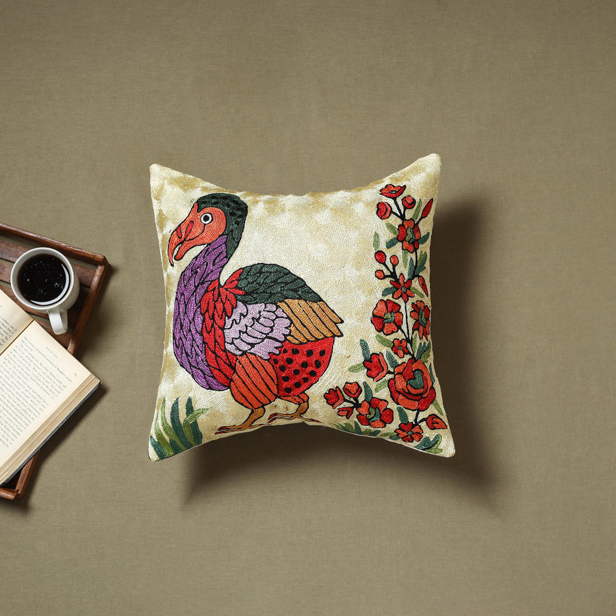 This beige cushion cover features fine-quality kashmiri crewel hand embroidery made with silk thread using traditional chain stitch work. Crewel is a centuries-old surface embroidery from Kashmir, created with wool or silk yarn using various stitches to form beautiful designs. The detailed patterns add a rich, artistic charm to any space perfect for enhancing the look of your sofa, chair, or bed.