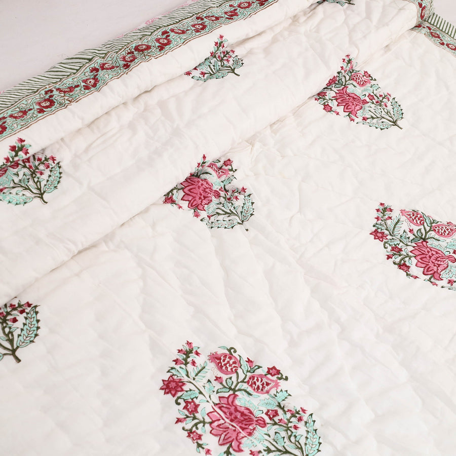 Wrap yourself in the unmatched softness of a handcrafted single - reversible sanganeri block print cotton quilt. Designed with timeless block prints from Sanganer, Rajasthan, these quilts feature reversible designs. Made with VAT dyes, ensuring vibrant, fade-free patterns, they are lightweight yet cozy, perfect for chilly nights or everyday use. Each piece reflects India’s rich cultural heritage and artisan dedication. Shop now and bring an eco-friendly, artisanal touch to your home.