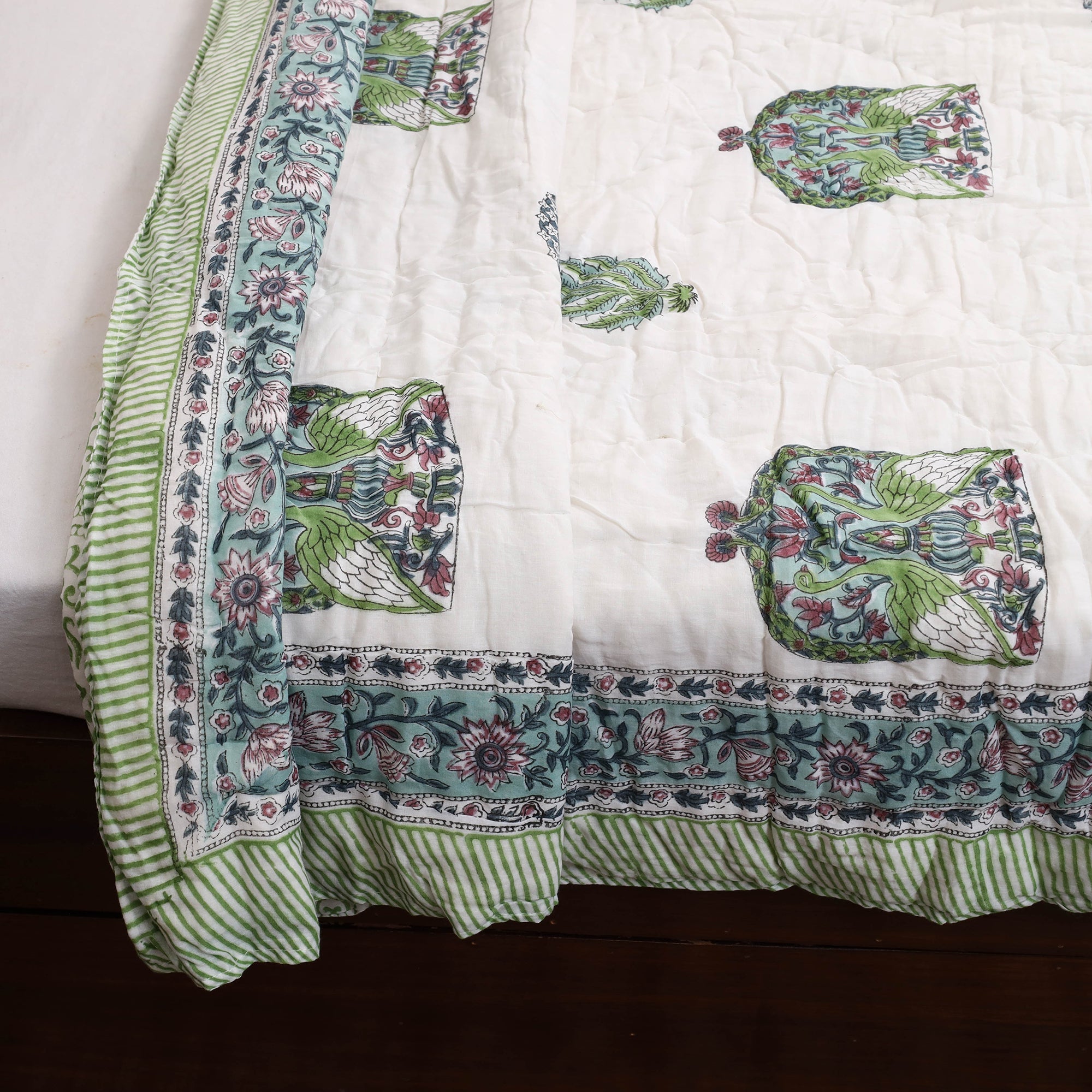 Wrap yourself in the unmatched softness of a handcrafted single - reversible sanganeri block print cotton quilt. Designed with timeless block prints from Sanganer, Rajasthan, these quilts feature reversible designs. Made with VAT dyes, ensuring vibrant, fade-free patterns, they are lightweight yet cozy, perfect for chilly nights or everyday use. Each piece reflects India’s rich cultural heritage and artisan dedication. Shop now and bring an eco-friendly, artisanal touch to your home.