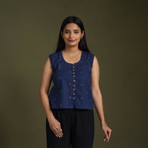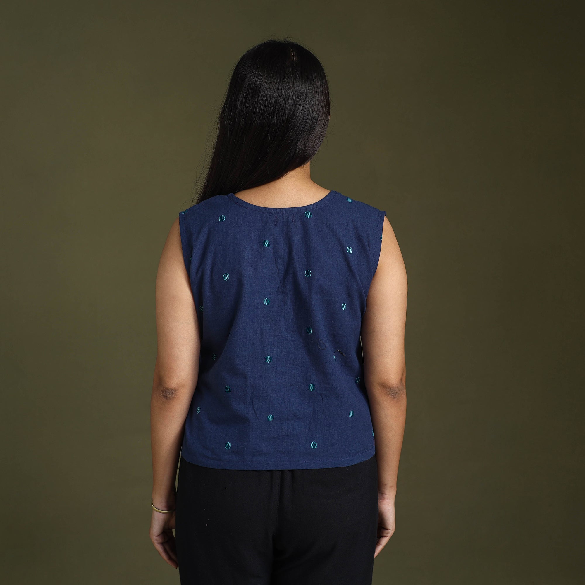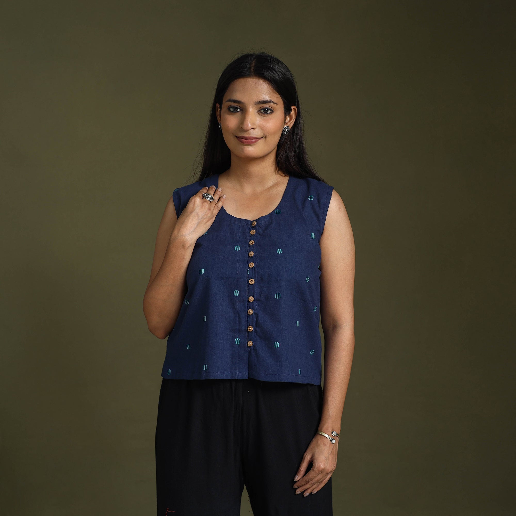 Stay effortlessly stylish with this sleeveless blue jacquard crop top, crafted from pre-washed cotton. Designed with front button detailing and a subtle woven texture, it blends traditional jacquard weaving techniques with a contemporary aesthetic. Whether paired with jeans, skirts, or ethnic bottoms, this jacquard crop top adds versatile charm to your wardrobe.