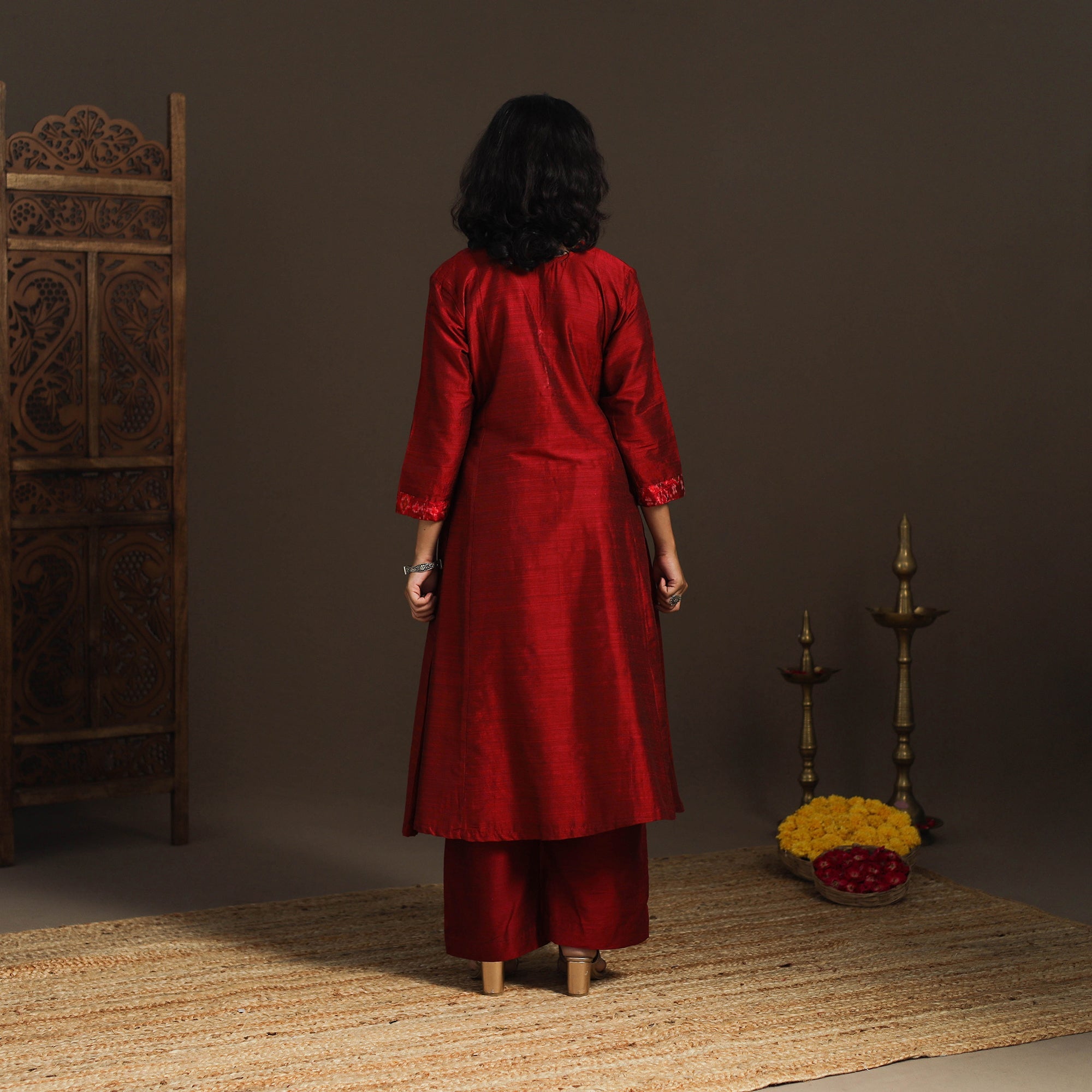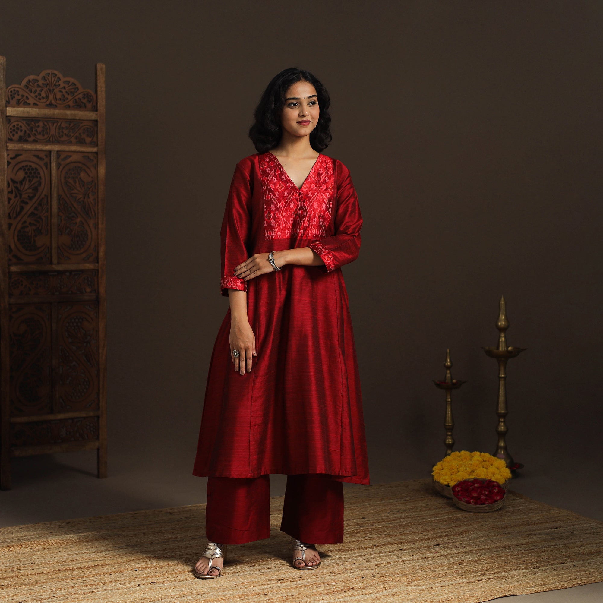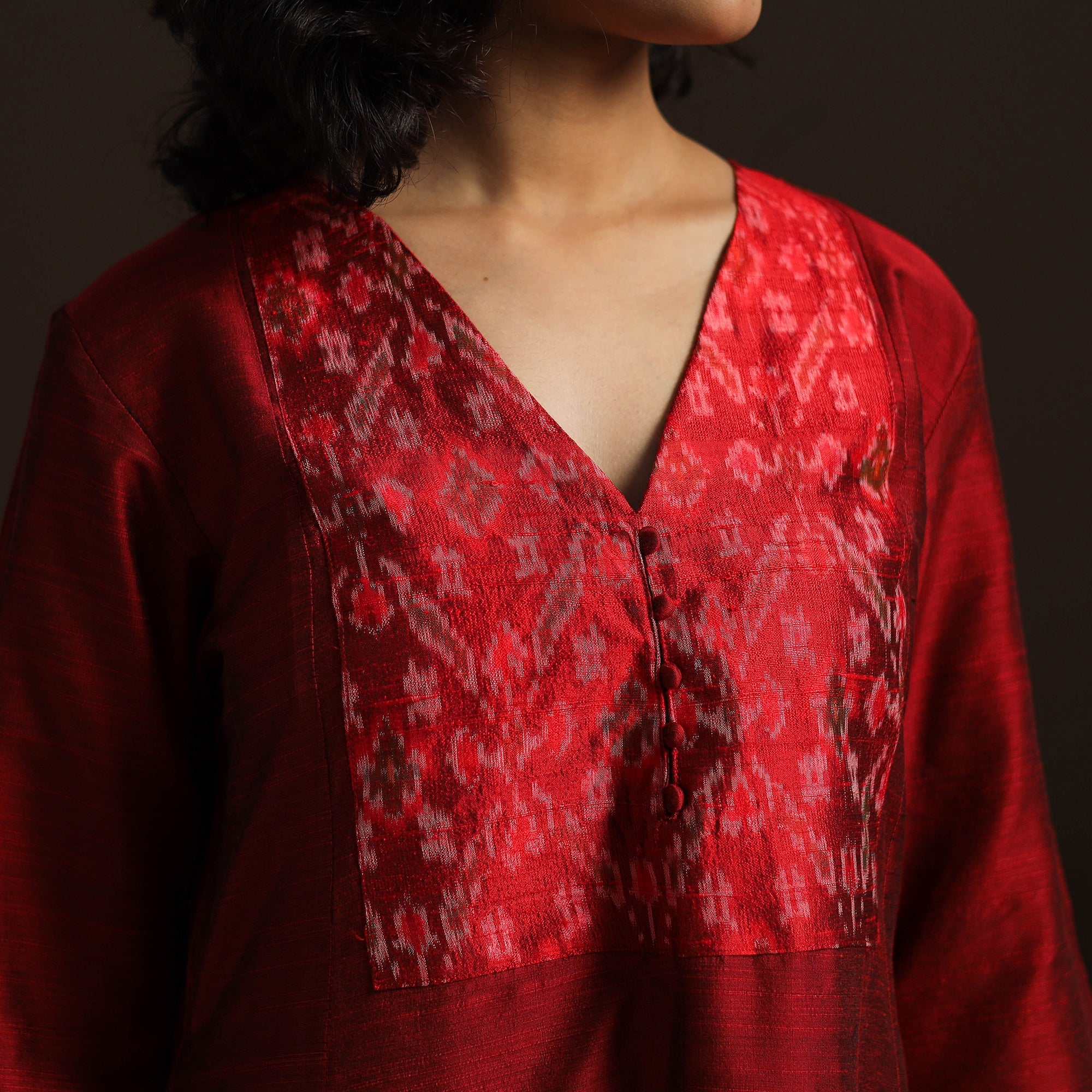 This red plain slub silk A-line kurta blends simplicity with elegance, highlighted by an ikat patch that lends a handcrafted charm. Featuring a practical side pocket, it offers ease and style, making it a versatile pick for office wear, casual outings, or festive occasions.