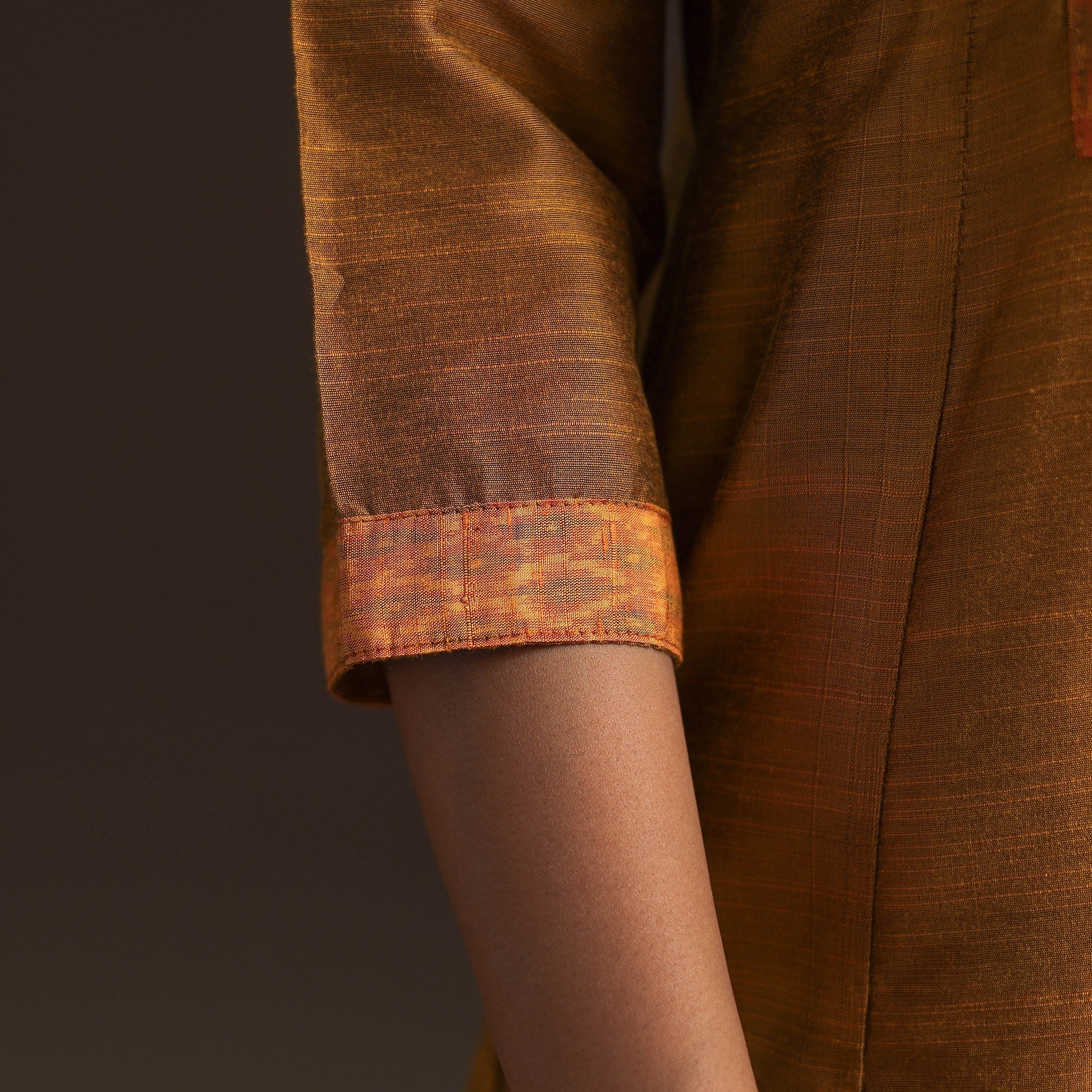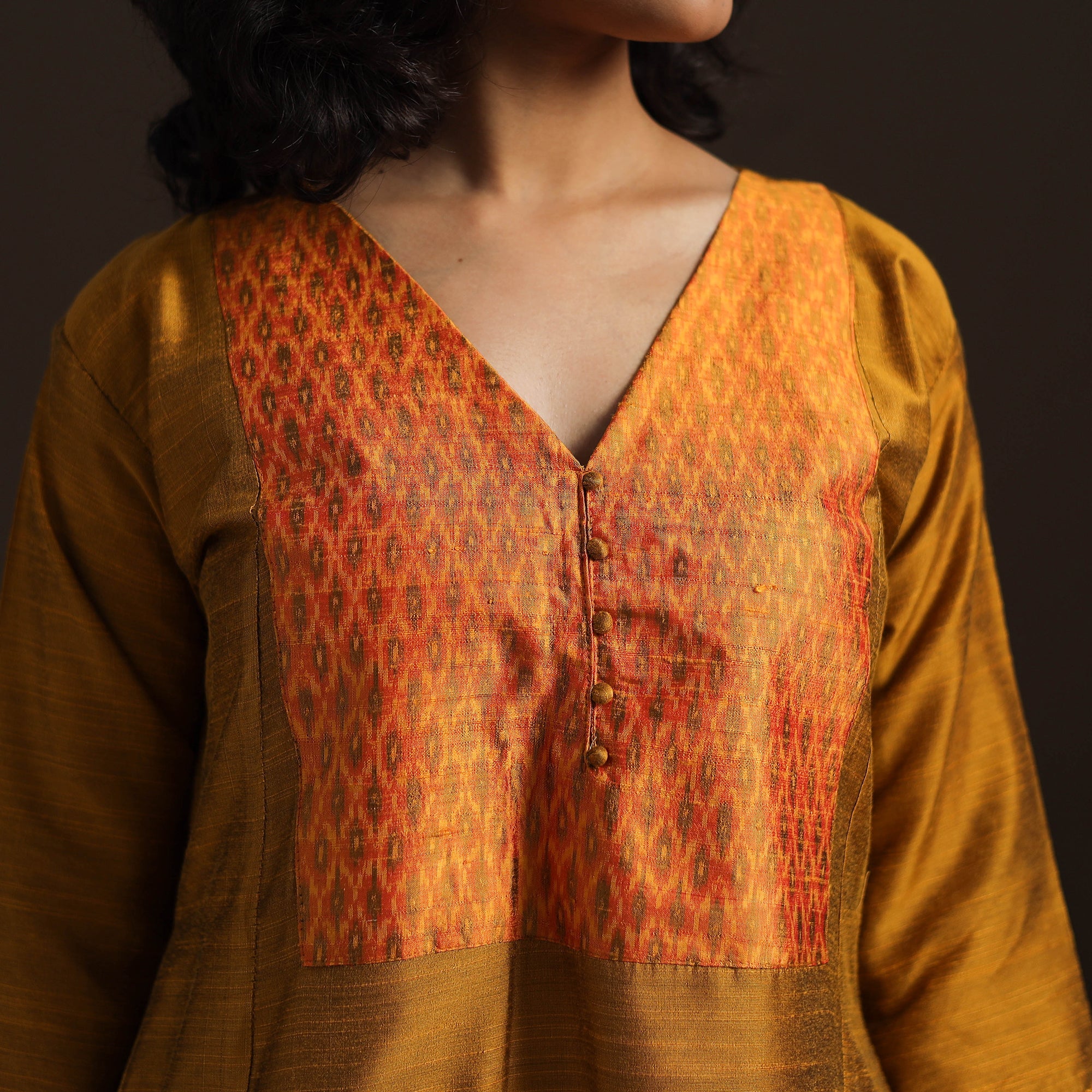 This yellow plain slub silk A-line kurta blends simplicity with elegance, highlighted by an ikat patch that lends a handcrafted charm. Featuring a practical side pocket, it offers ease and style, making it a versatile pick for office wear, casual outings, or festive occasions.