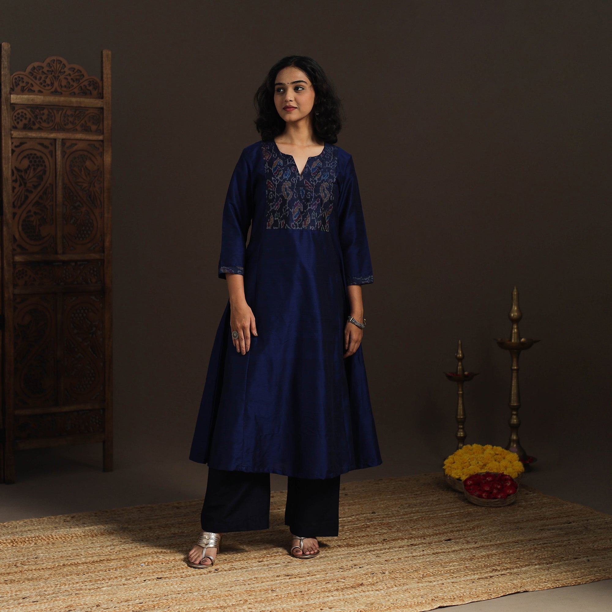 This plain slub silk A-line kurta blends simplicity with elegance, highlighted by an ikat patch that lends a handcrafted charm. Featuring a practical side pocket, it offers ease and style, making it a versatile pick for office wear, casual outings, or festive occasions.