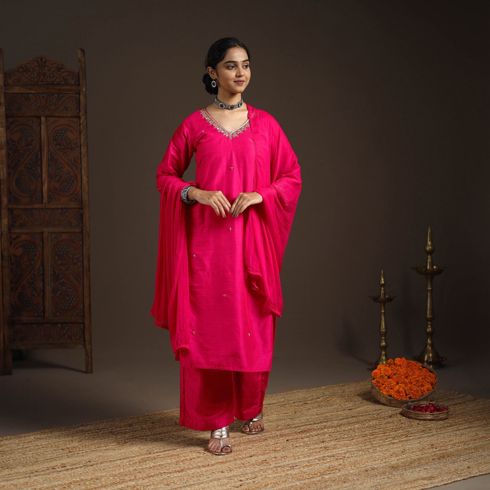 This pink plain slub silk straight kurta set combines simplicity with elegance, enhanced by delicate hand embroidery. The kurta includes a practical side pocket, while the coordinated palazzo comes with two functional pockets for added comfort. Paired with a soft chiffon dupatta, the ensemble balances style with utility. Ideal for office wear, casual outings, or festive gatherings, it transitions seamlessly across occasions.