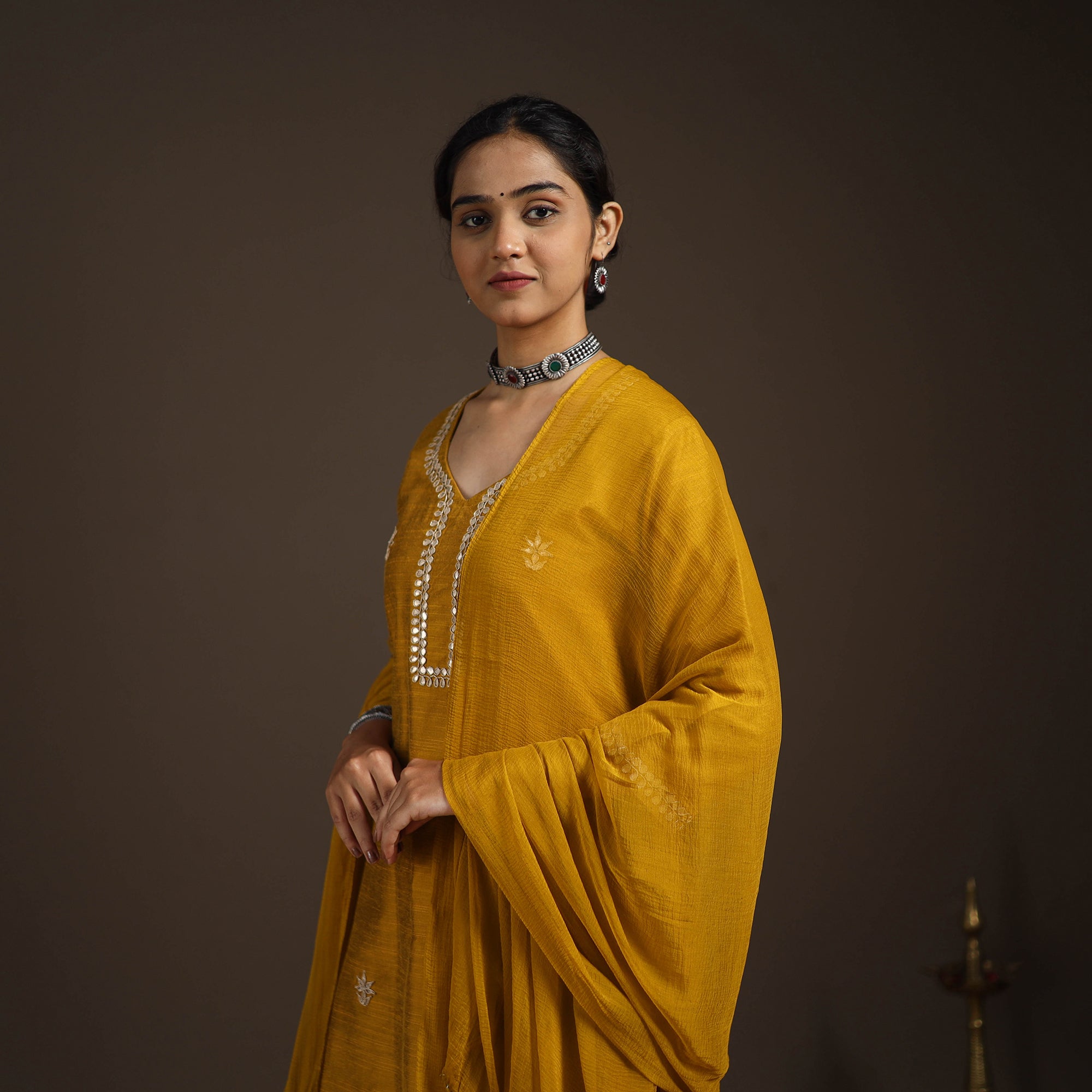 This yellow plain slub silk straight kurta set blends simplicity with elegance, highlighted by delicate gota work. The kurta features a handy side pocket, while the matching palazzo is designed with two practical pockets for added ease. Paired with a soft chiffon dupatta, the set brings together both style and comfort. Ideal for office wear, casual outings, or festive gatherings, it adapts seamlessly to every occasion.