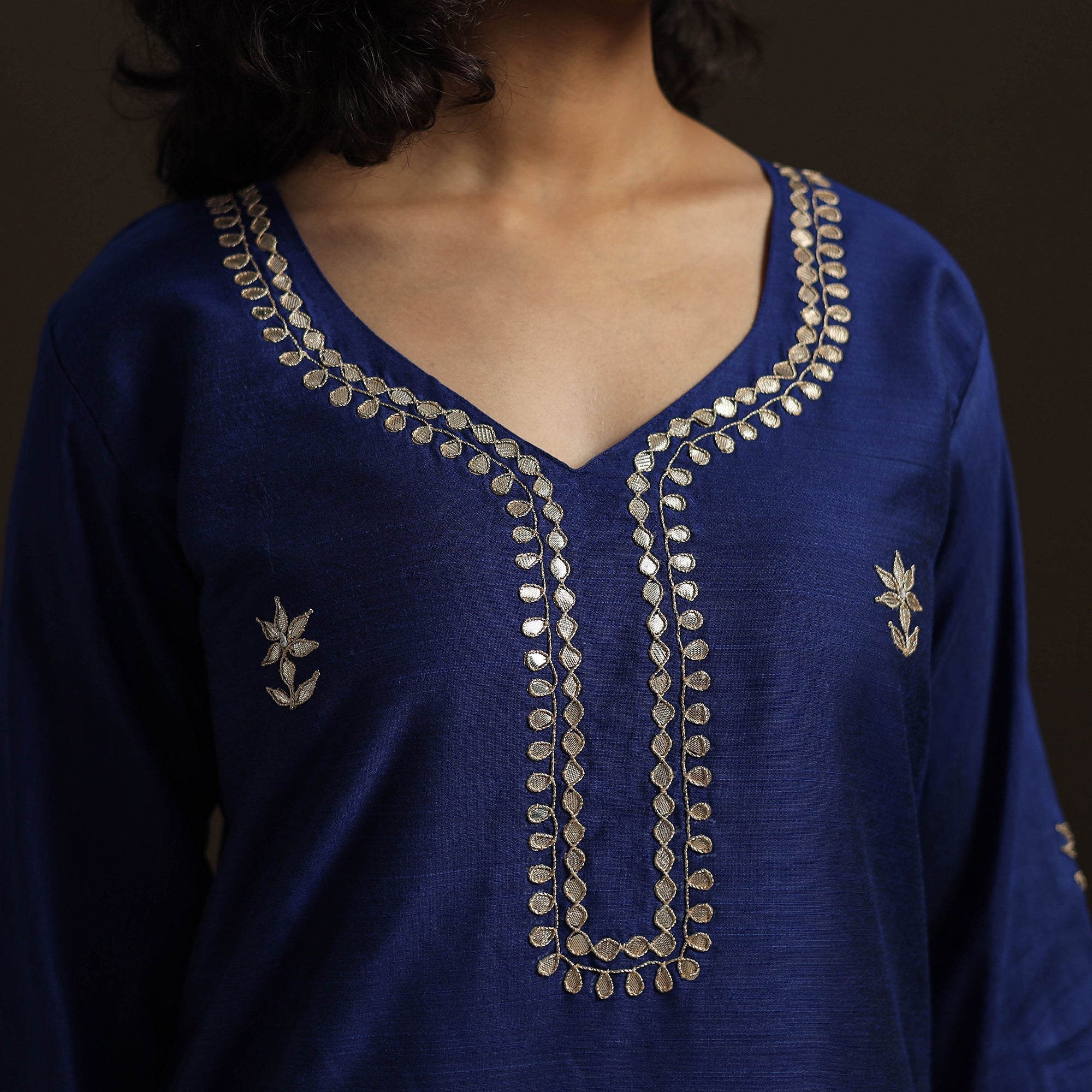 This blue plain slub silk straight kurta blends simplicity with elegance, featuring delicate gota work. Designed with a functional side pocket, it ensures comfort and ease for daily wear. Perfect for office hours, casual outings, or festive layering, this versatile piece adapts effortlessly to every setting. Pair it with matching bottoms or a vibrant dupatta to create a refined look that beautifully balances tradition with modern appeal.