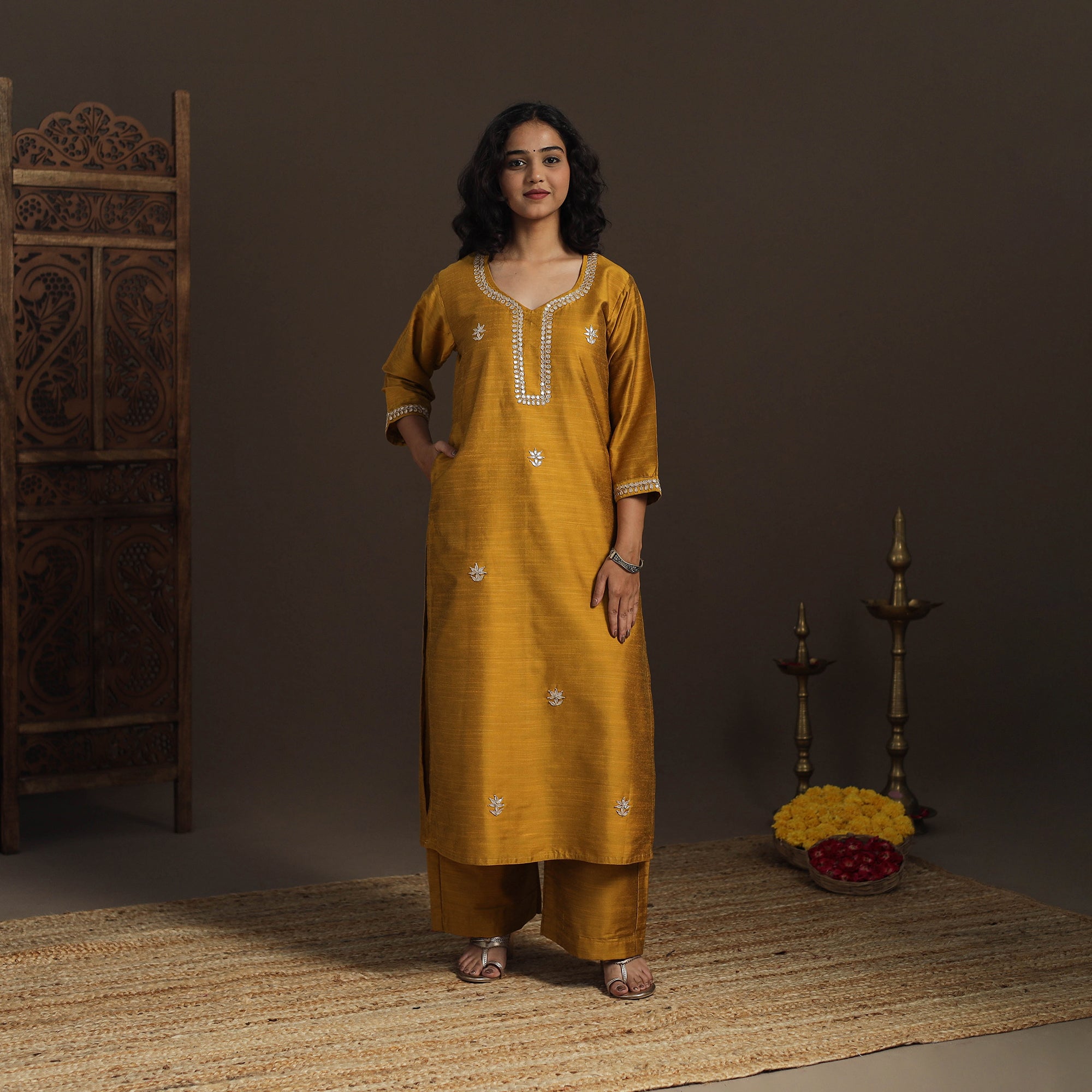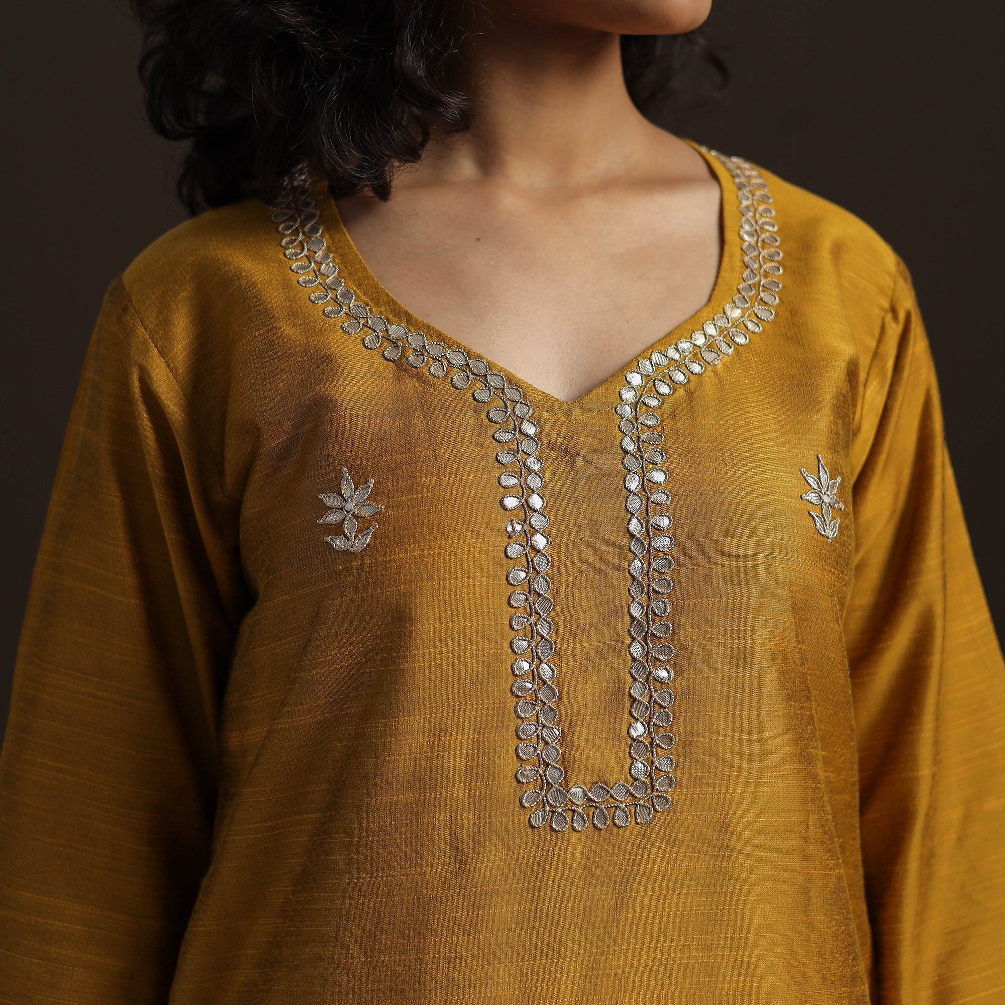 This yellow plain slub silk straight kurta blends simplicity with elegance, featuring delicate gota work. Designed with a functional side pocket, it ensures comfort and ease for daily wear. Perfect for office hours, casual outings, or festive layering, this versatile piece adapts effortlessly to every setting. Pair it with matching bottoms or a vibrant dupatta to create a refined look that beautifully balances tradition with modern appeal.