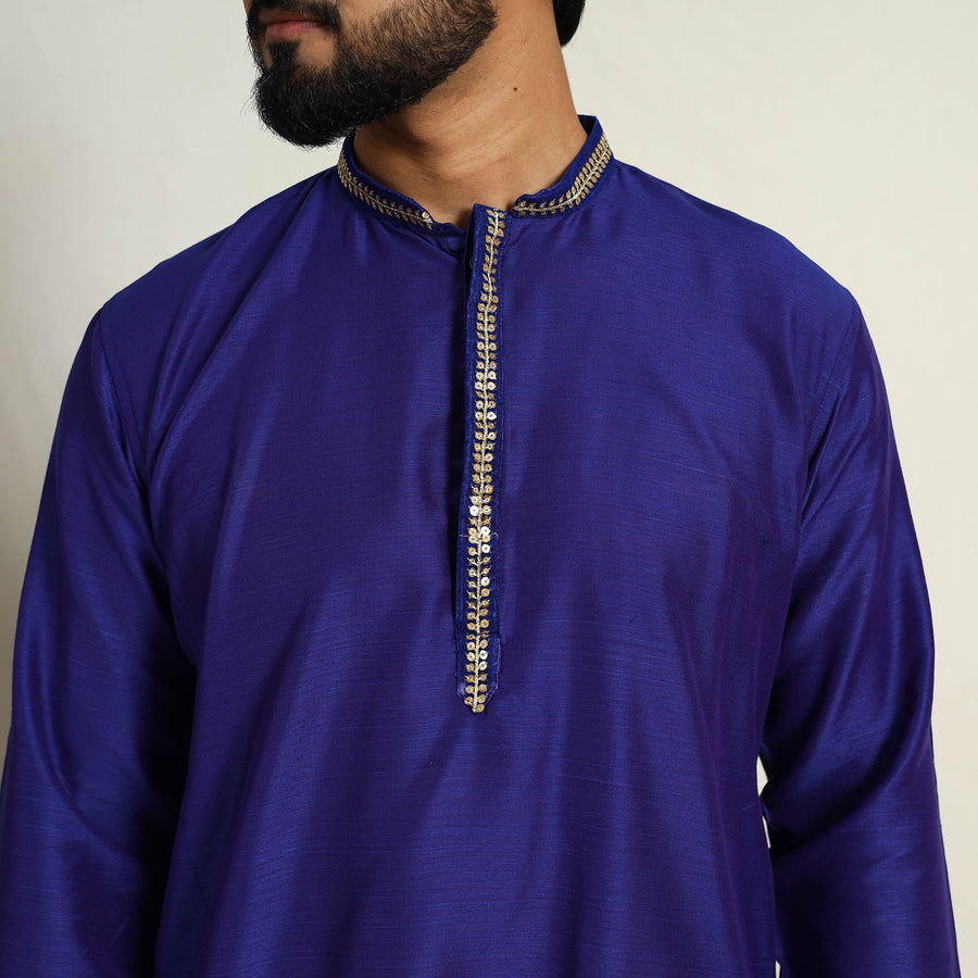 Royal blue slub silk kurta for men featuring a embellished neckline work, mandarin collar, button closure, full sleeves, and two side pockets. The breathable slub silk fabric ensures all-day comfort, while the subtle neck detailing adds a refined touch. This casual long kurta is perfect for both daily outings and special occasions.