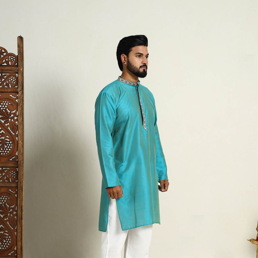 Sky blue slub silk kurta for men featuring a embellished neckline work, mandarin collar, button closure, full sleeves, and two side pockets. The breathable slub silk fabric ensures all-day comfort, while the subtle neck detailing adds a refined touch. This casual long kurta is perfect for both daily outings and special occasions.