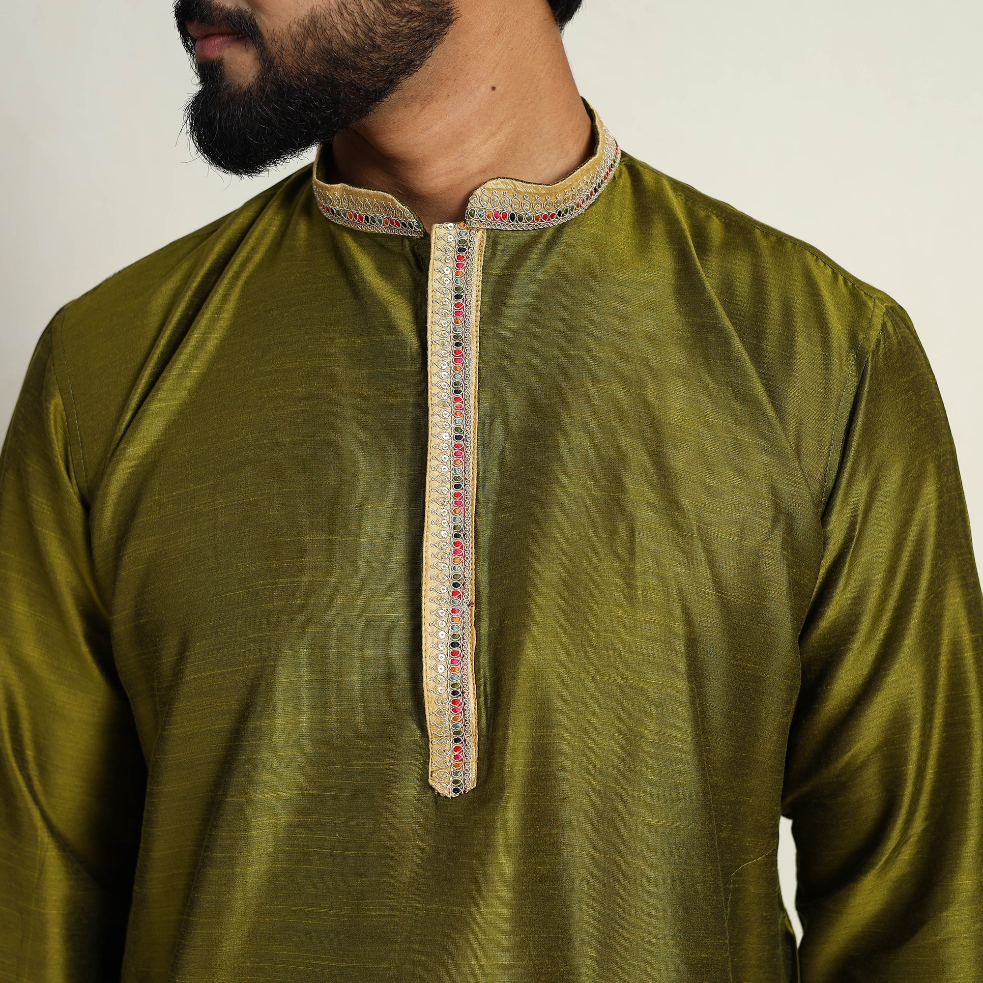 Olive green slub silk kurta for men featuring a embellished neckline work, mandarin collar, button closure, full sleeves, and two side pockets. The breathable slub silk fabric ensures all-day comfort, while the subtle neck detailing adds a refined touch. This casual long kurta is perfect for both daily outings and special occasions.