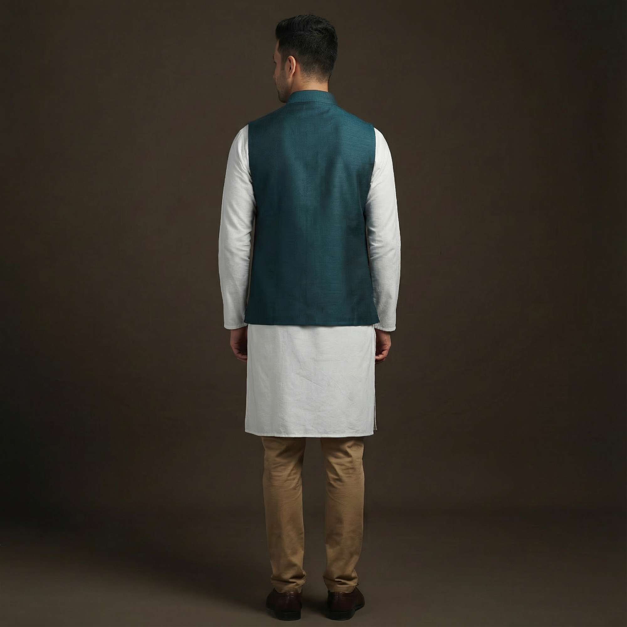 Men green plain nehru jacket is a perfect blend of traditional and modern style. Made from a blend of viscose and polyester, it has a smooth, solid texture. It is not pure silk but offers a refined look. The jacket features a smart Chinese collar, a sleeveless design, and three functional outer pockets, making it both stylish and convenient. Pair it with a kurta-pajama for any occasions, layer it over a shirt and trousers for semi-formal events or style it with denim for a contemporary casual look. A versatile piece that effortlessly elevates any outfit.