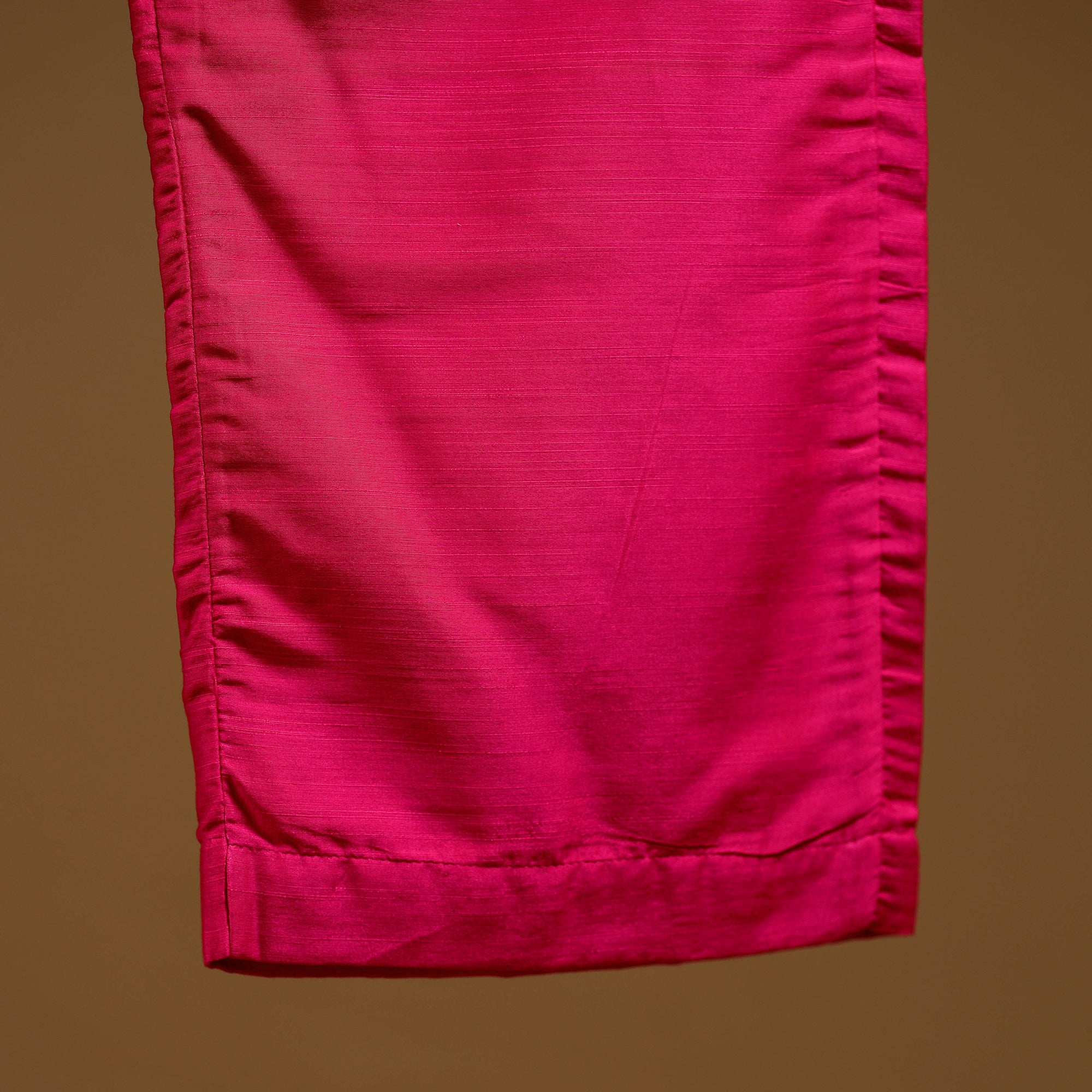 Made from a blend of viscose and polyester, this pink slub silk plain palazzo features a soft texture and a gentle sheen. Designed with an elasticated waistband and two side pockets for ease, it is a versatile piece that pairs well with kurtas, tunics, or tops, perfect for casual outings or festive styling.