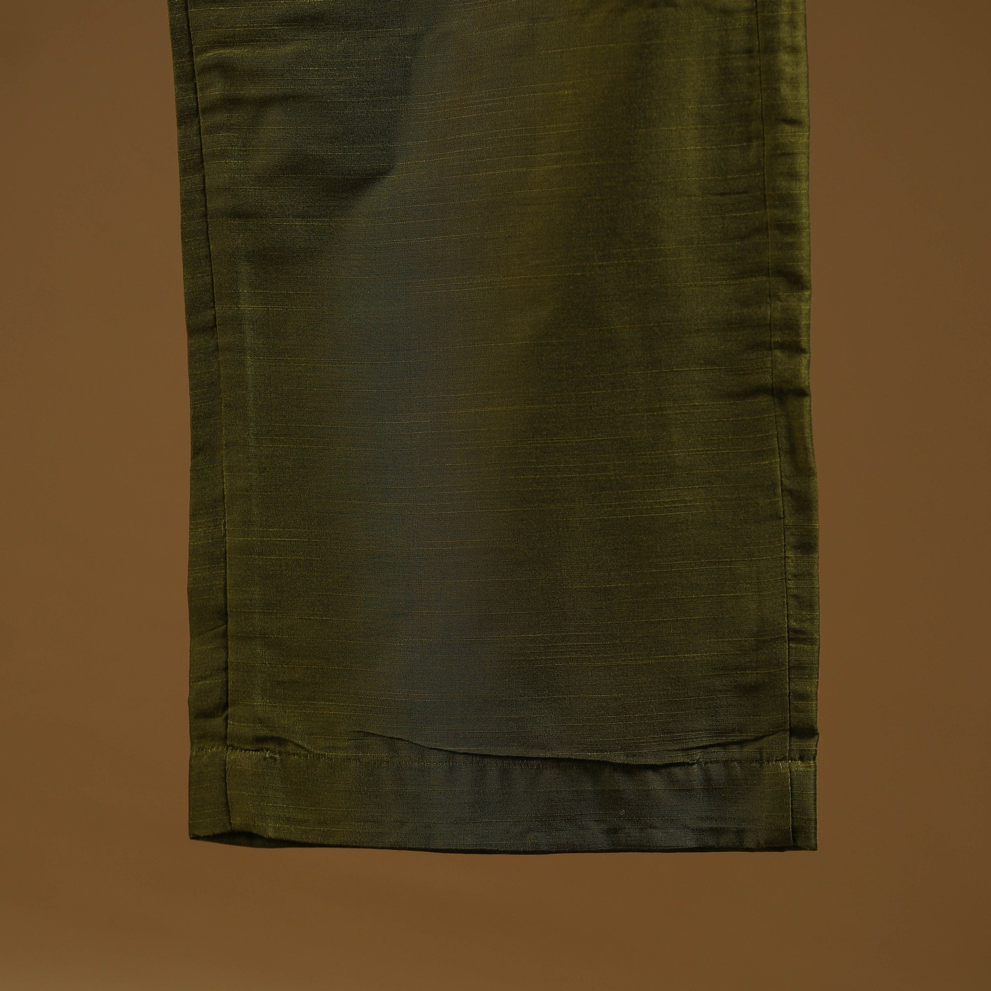 Made from a blend of viscose and polyester, this green slub silk plain palazzo features a soft texture and a gentle sheen. Designed with an elasticated waistband and two side pockets for ease, it is a versatile piece that pairs well with kurtas, tunics, or tops, perfect for casual outings or festive styling.