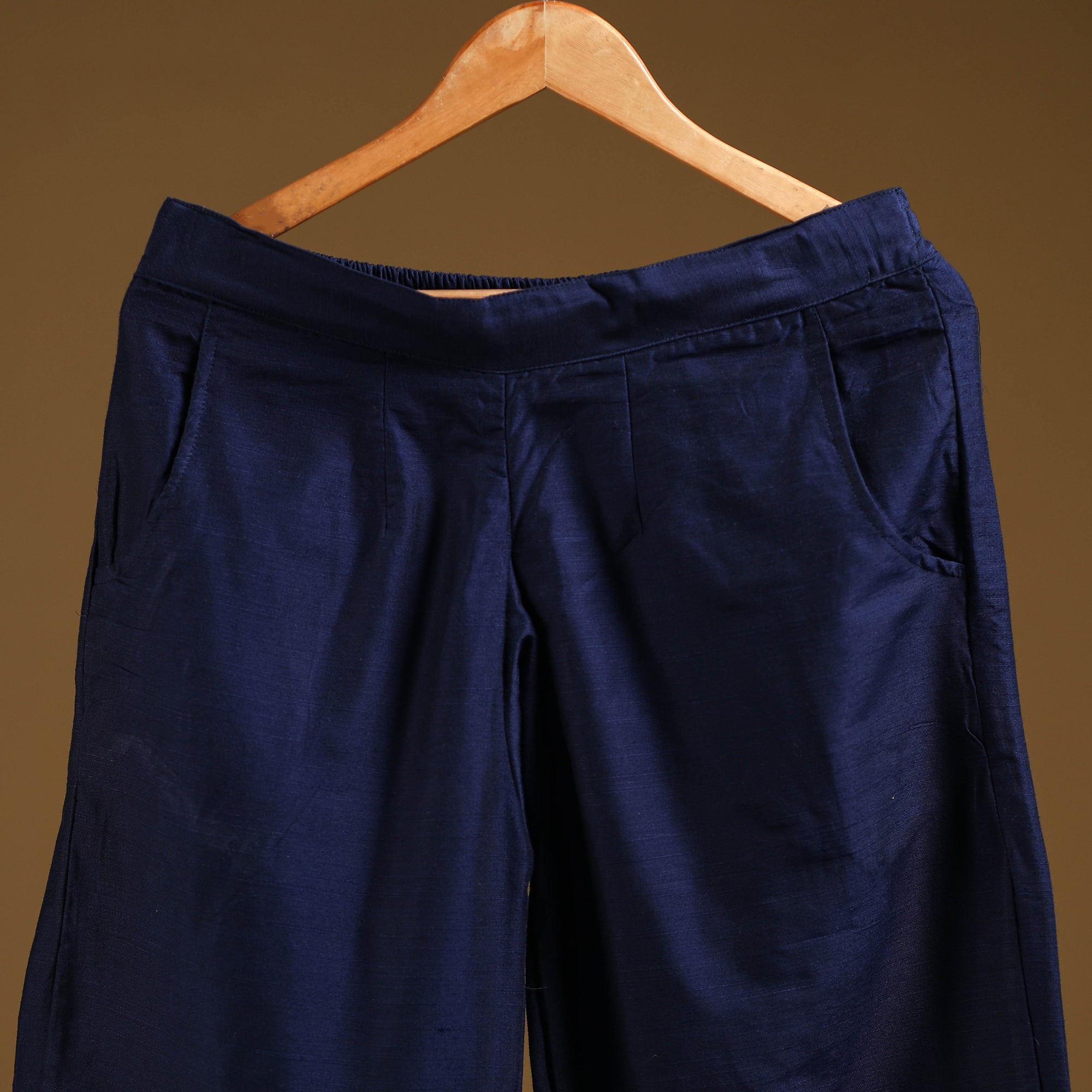 Made from a blend of viscose and polyester, this blue slub silk plain palazzo features a soft texture and a gentle sheen. Designed with an elasticated waistband and two side pockets for ease, it is a versatile piece that pairs well with kurtas, tunics, or tops, perfect for casual outings or festive styling.