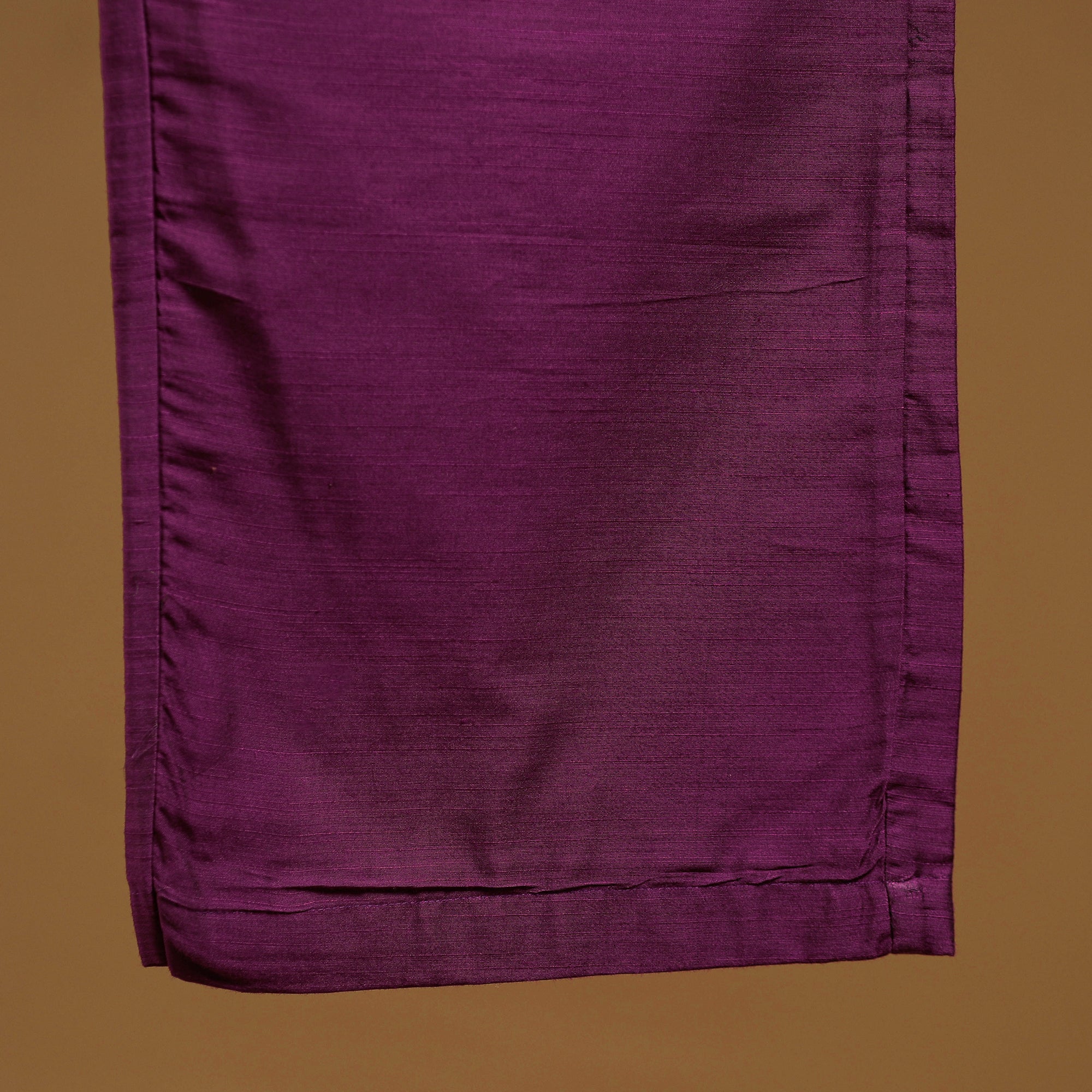 Made from a blend of viscose and polyester, this purple slub silk plain palazzo features a soft texture and a gentle sheen. Designed with an elasticated waistband and two side pockets for ease, it is a versatile piece that pairs well with kurtas, tunics, or tops, perfect for casual outings or festive styling.