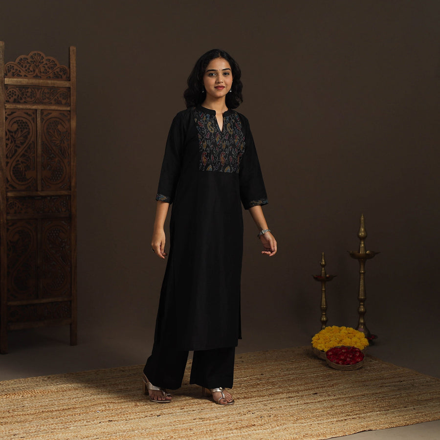 This plain slub silk straight kurta blends simplicity with elegance, featuring an ikat patch that adds a handcrafted detail. Designed with a practical side pocket, it offers both functionality and style, making it a versatile choice for office wear, casual outings, or festive occasions.