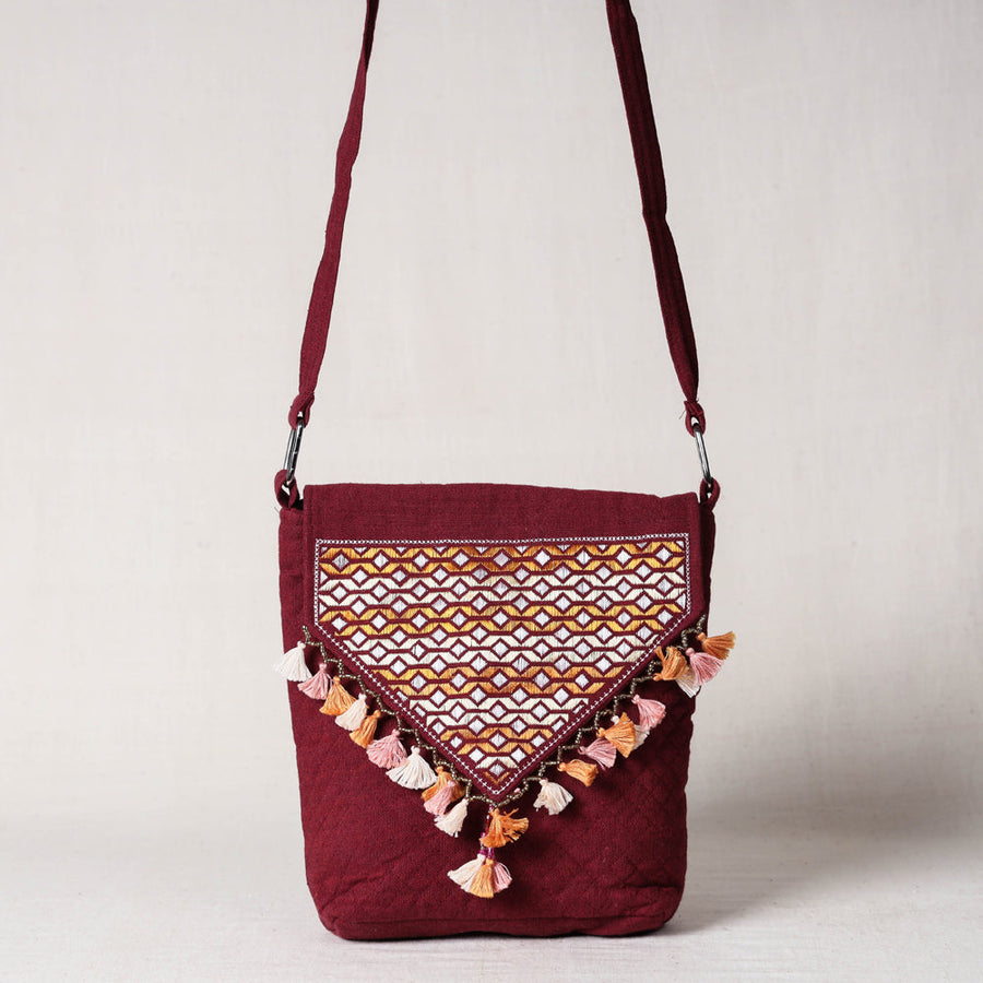 Fine quality maroon soof stitch embroidery pure handloom mashru silk sling flap bag. It has one zipper pocket inside & one zipper pocket on backside. Ample space to keep most of your essentials.