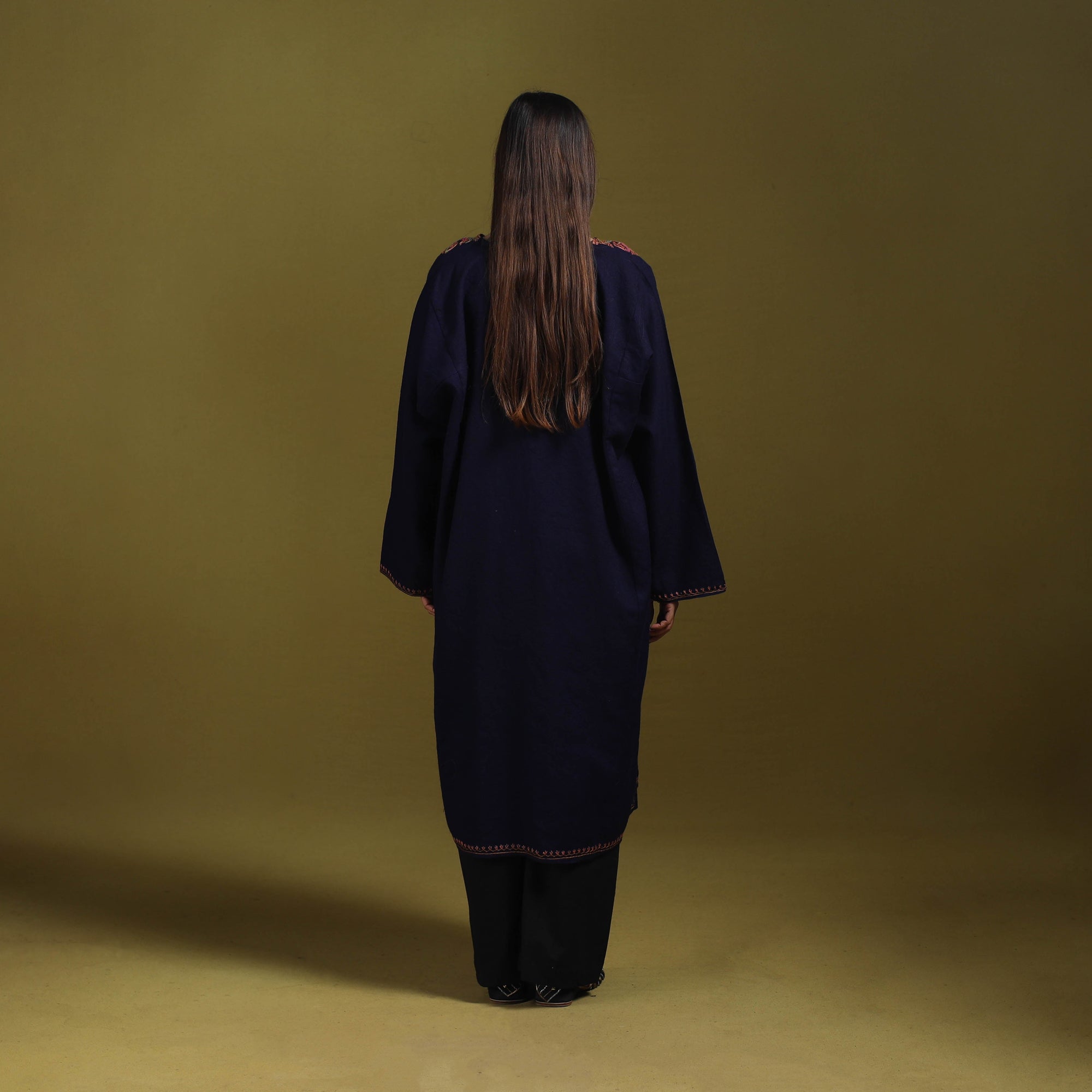 | Material | Blue sozni hand embroidered kashmiri pheran is crafted by artisan Zahoor Ahmed from Harwan, Kashmir. Made with merino wool, it offers cozy warmth for winter wear. The detailed sozni hand embroidery reflects kashmiri craftsmanship and cultural heritage. Designed with a comfortable fit and two side pockets, the pheran blends tradition with everyday functionality, making it versatile for both casual and cultural occasions. |