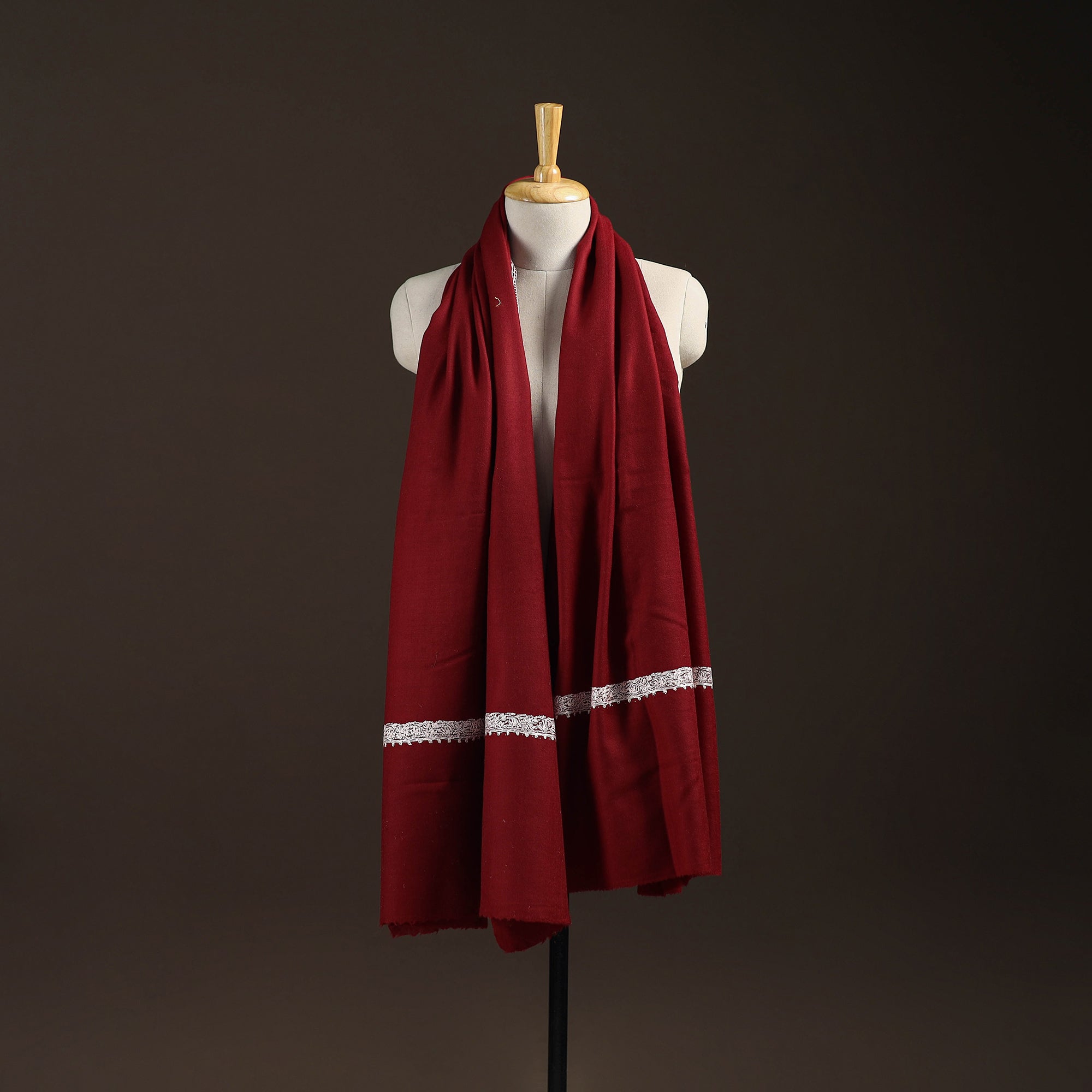 | Material | Maroon kashmiri handspun, handwoven dordaar pashmina shawl is made from pure merino wool and adorned with delicate sozni hand embroidery by skilled artisan Muzaffar Ahmed Makayee. The process begins with sketching fine patterns on the fabric, followed by careful thread selection and traditional stitches such as satin, chain, and the unique “Dorukha” method, which makes motifs visible on both sides. The entire process takes around 45 days to complete. After months of intricate work, the shawl is soft and versatile, making it ideal for festive wear, daily elegance or gifting as a piece of Kashmiri tradition. |