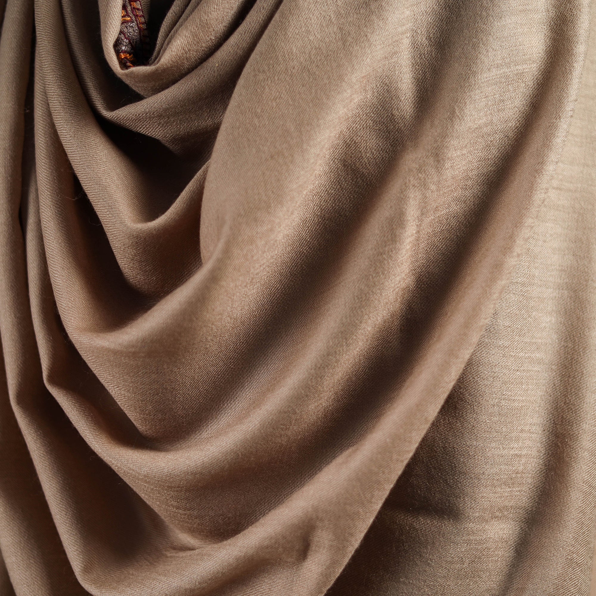 Brown kashmiri handspun, handwoven dordaar pashmina shawl is made from pure merino wool and adorned with delicate sozni hand embroidery by skilled artisan Muzaffar Ahmed Makayee. The process begins with sketching fine patterns on the fabric, followed by careful thread selection and traditional stitches such as satin, chain, and the unique “Dorukha” method, which makes motifs visible on both sides. The entire process takes around 45 days to complete. After months of intricate work, the shawl is soft and versatile, making it ideal for festive wear, daily elegance or gifting as a piece of Kashmiri tradition.