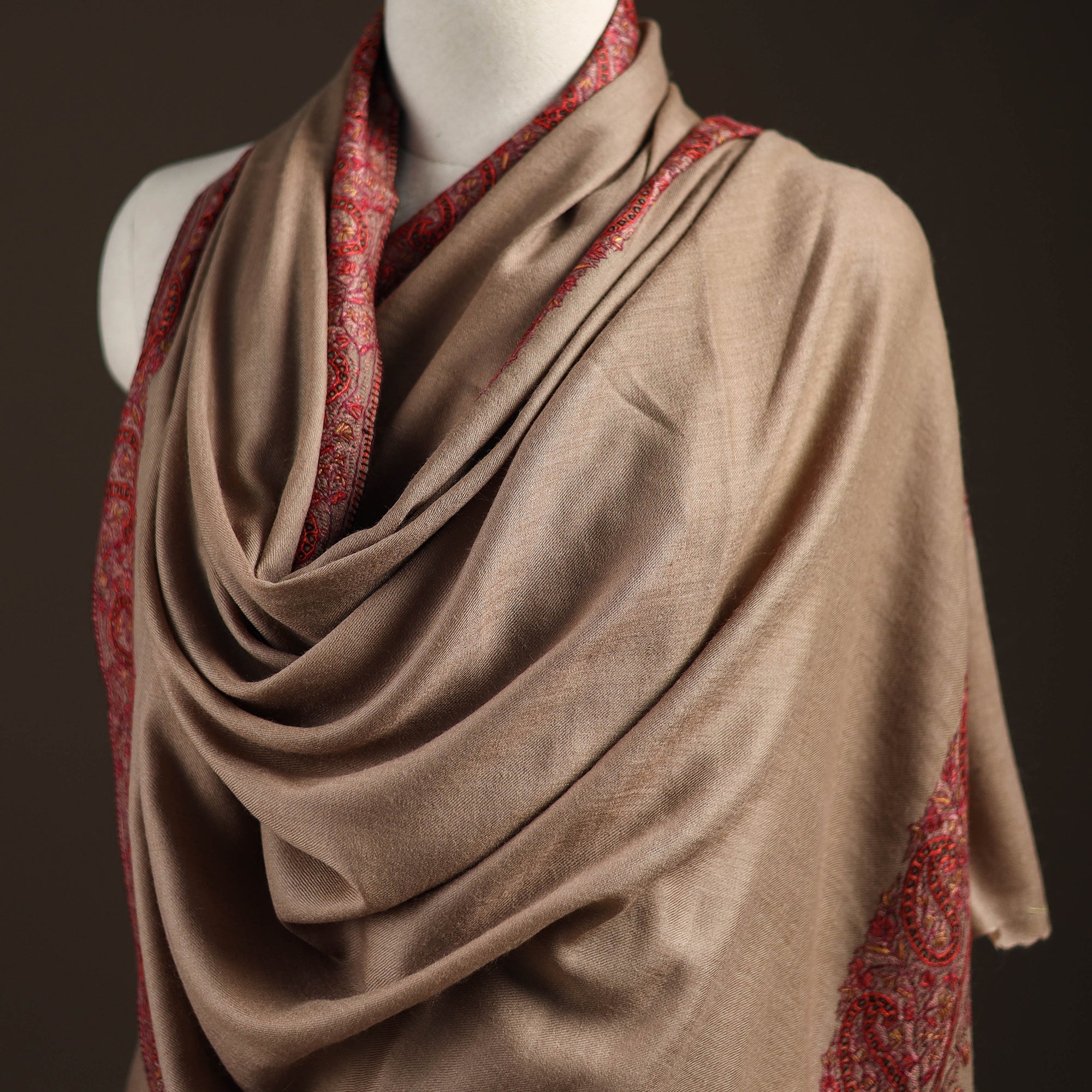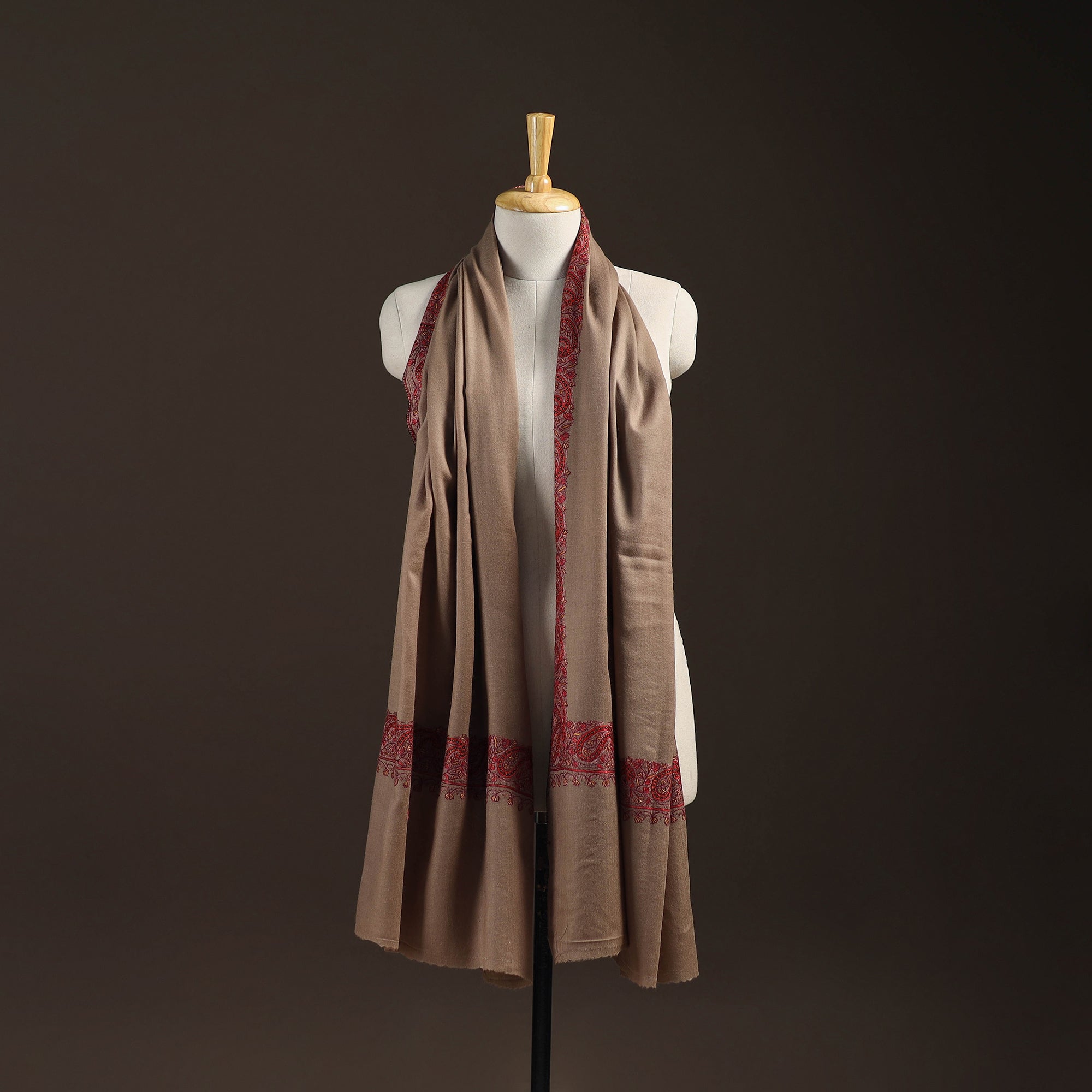 Brown kashmiri handspun, handwoven hashidar pashmina shawl is made from pure merino wool and adorned with delicate sozni hand embroidery by skilled artisan Muzaffar Ahmed Makayee. The process begins with sketching fine patterns on the fabric, followed by careful thread selection and traditional stitches such as satin, chain and the unique “Dorukha” method, which makes motifs visible on both sides. The entire process takes around 20 days to complete, the shawl is soft and versatile, making it ideal for festive wear, daily elegance or gifting as a piece of Kashmiri tradition.