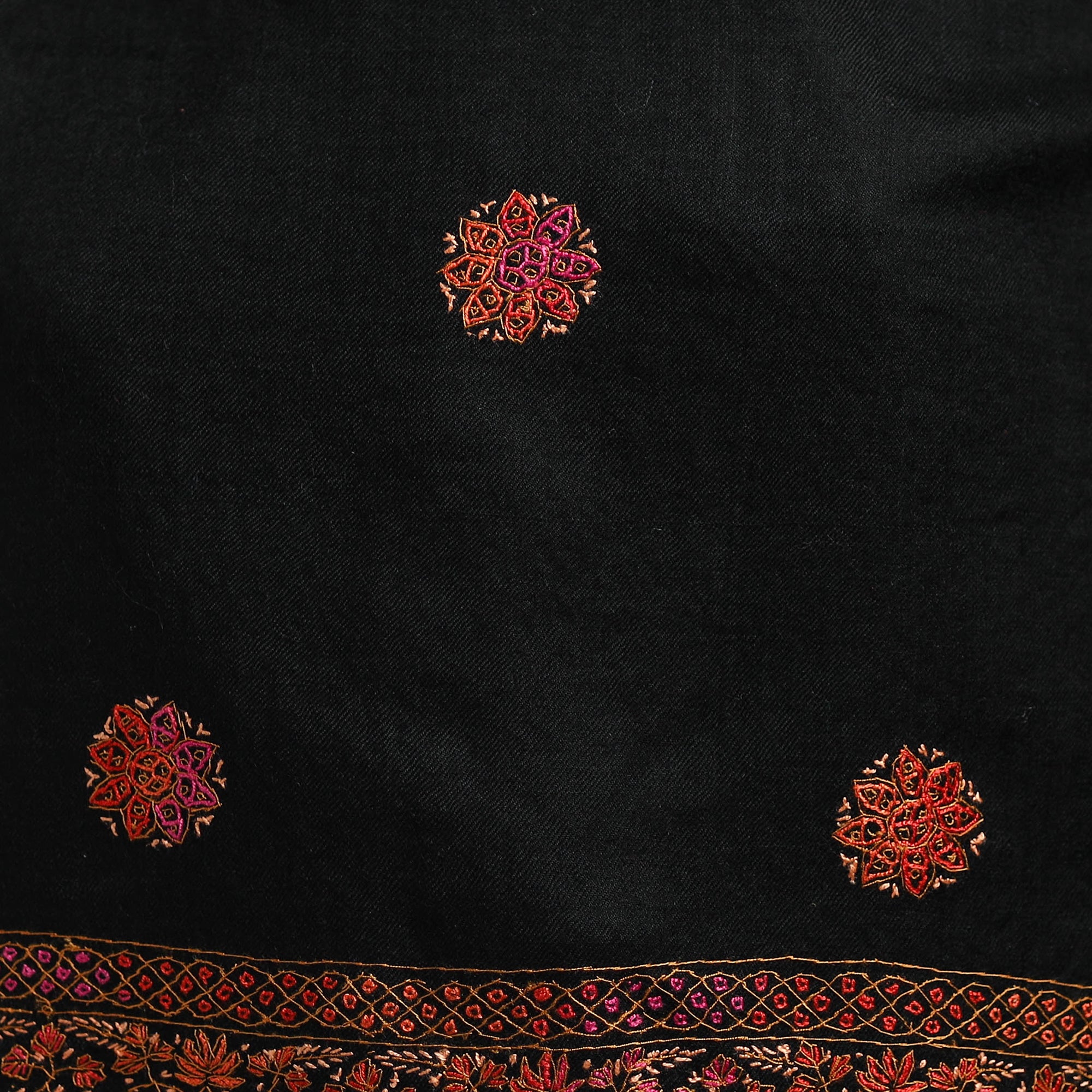 This black kashmiri sozni handloom shawl is woven from pure merino wool and adorned with delicate Sozni heavy hand embroidery by skilled artisans. The process begins with sketching fine patterns on the fabric, followed by careful thread selection and traditional stitches such as satin, chain, and the unique "Dorukha" method that makes motifs visible on both sides. After months of intricate work, it is ideal for festive wear, daily elegance, or gifting as a piece of Kashmiri tradition.