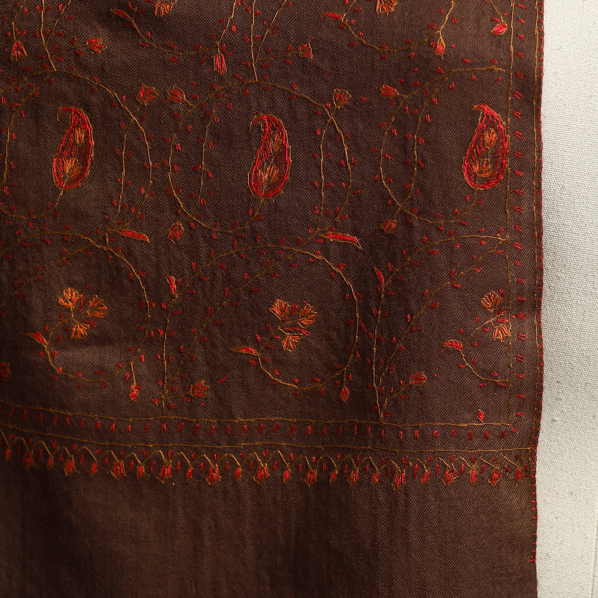 This brown kashmiri sozni handloom shawl is woven from pure merino wool and adorned with delicate Sozni heavy hand embroidery by skilled artisans. The process begins with sketching fine patterns on the fabric, followed by careful thread selection and traditional stitches such as satin, chain, and the unique "Dorukha" method that makes motifs visible on both sides. After months of intricate work, it is ideal for festive wear, daily elegance, or gifting as a piece of Kashmiri tradition.