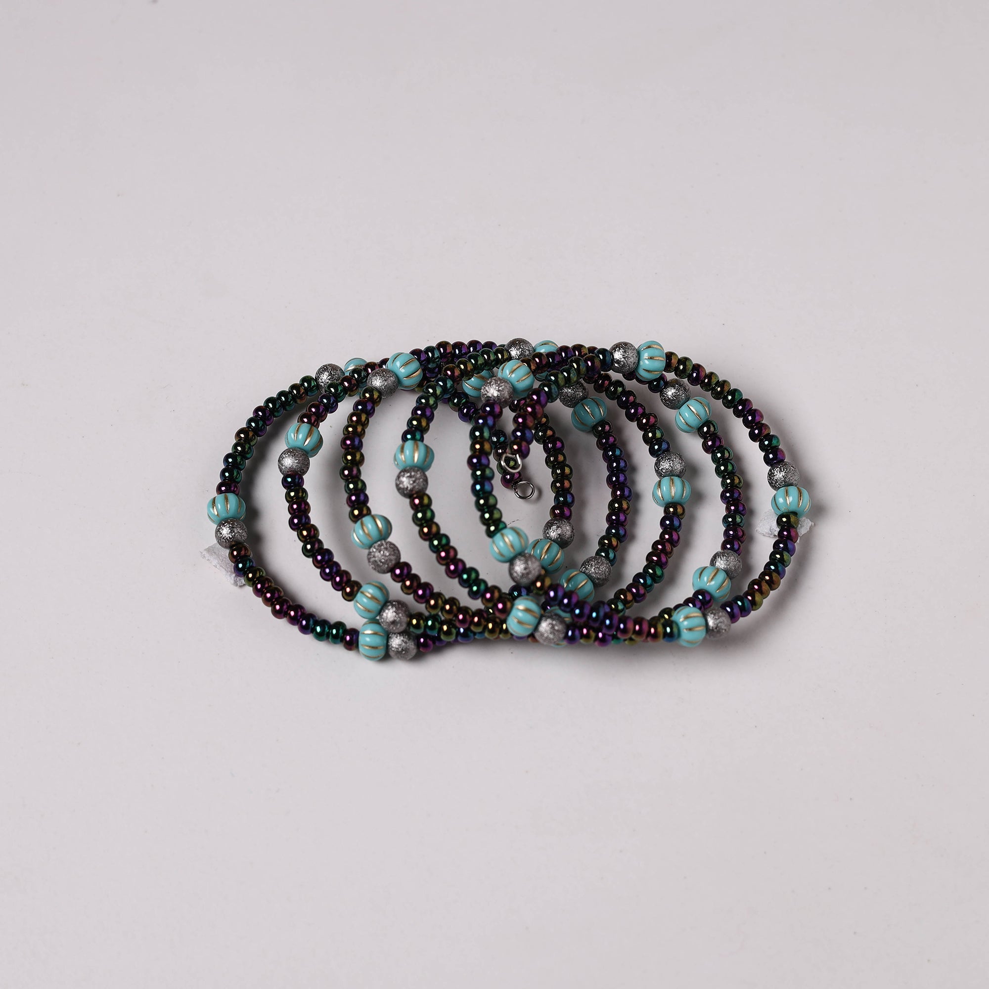 | Material | Spiral handmade beaded bracelet by Sujata Gokhale. This handmade jewelry is an eclectic collection of beads and gemstones. It features a stunning spiral design that showcases artistry and unique charm. |