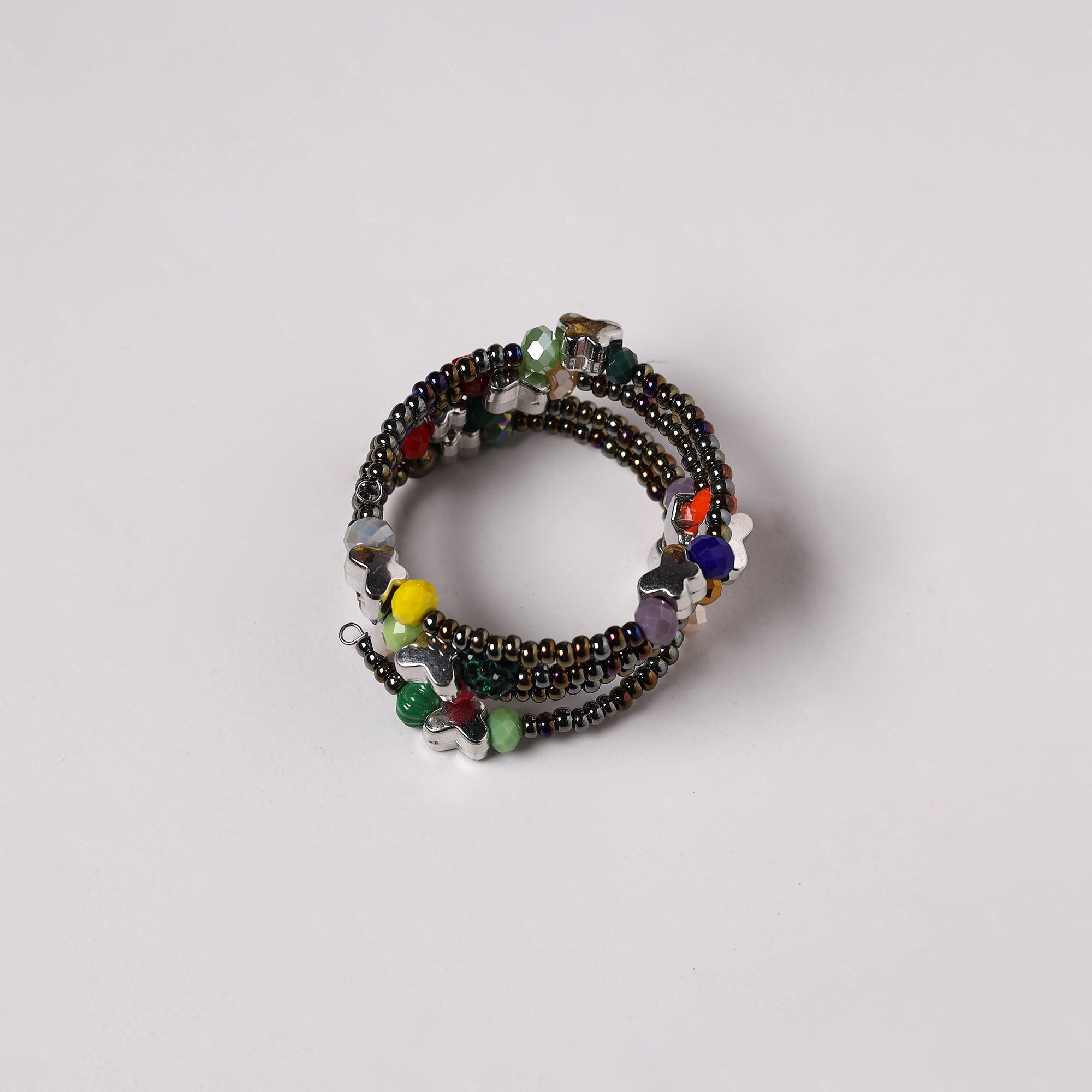 | Material | Spiral handmade beaded bracelet by Sujata Gokhale. This handmade jewelry is an eclectic collection of beads and gemstones. It features a stunning spiral design that showcases artistry and unique charm. |