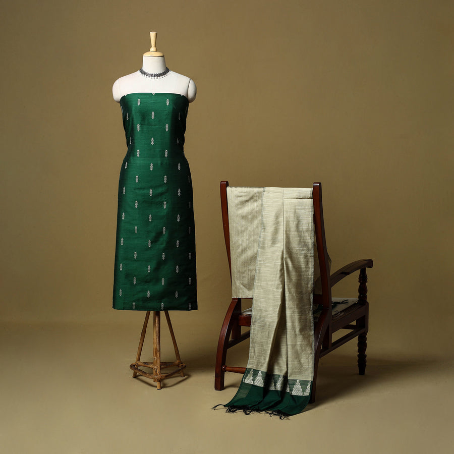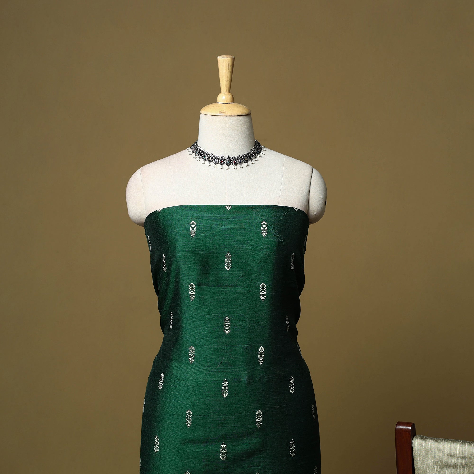 Green spun dupion silk thread buti unstitched dress material comes with a smooth, solid texture that feels elegant and polished. The set includes kurta fabric, a matching dupatta and a plain bottom, making it suitable for festive events, weddings and graceful everyday wear. Its refined look and versatile styling options make it an easy choice for any wardrobe.