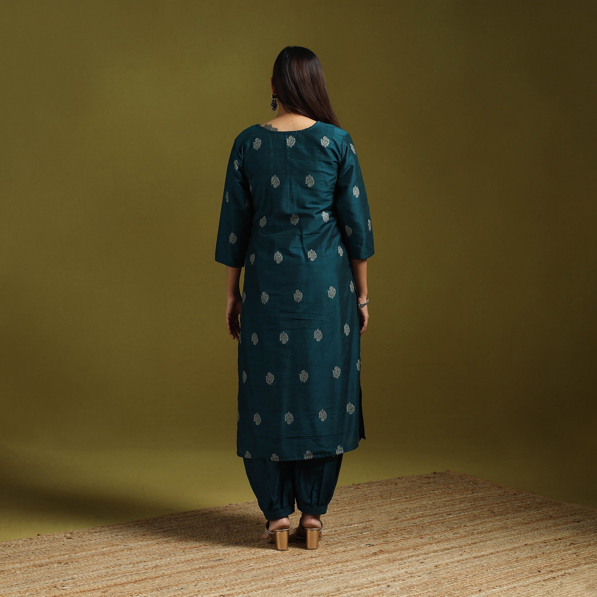 Green spun dupion viscose silk thread buti 2pc kurta set. Crafted from a viscose-polyester blend with a subtle silk-like texture, the straight kurta features a single side pocket. It is paired with a plain slub silk afghani salwar with an elasticised waistband for added comfort. Ideal for office wear, casual outings or small moments.