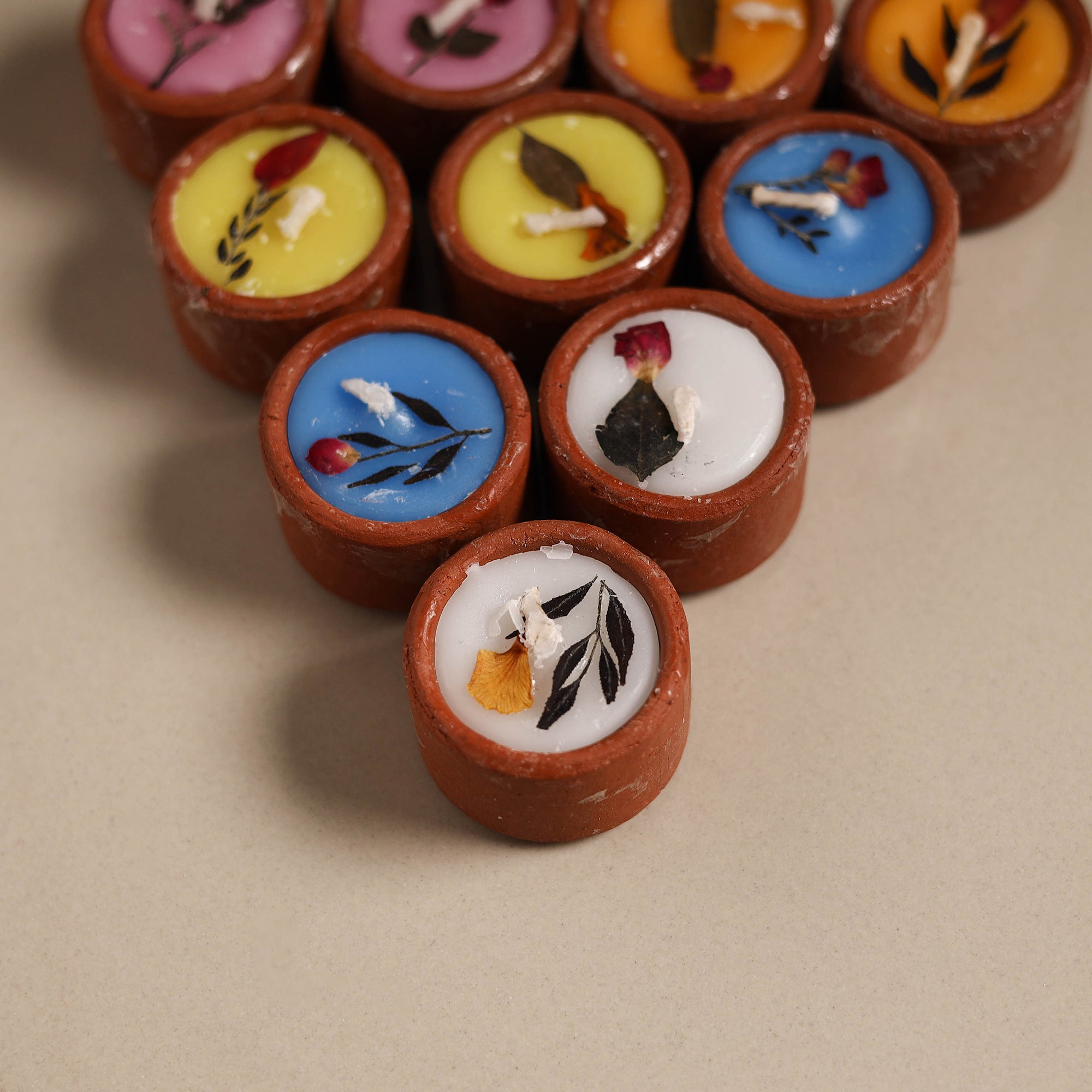 The sri aurobindo ashram ball clay diya with wax set is hand-poured with care. Each diya features delicately pressed dried blooms on its clay surface, adding a touch of natural elegance. Together, these diyas cast a gentle, enchanting glow, making them ideal for serene decor and festive celebrations.
