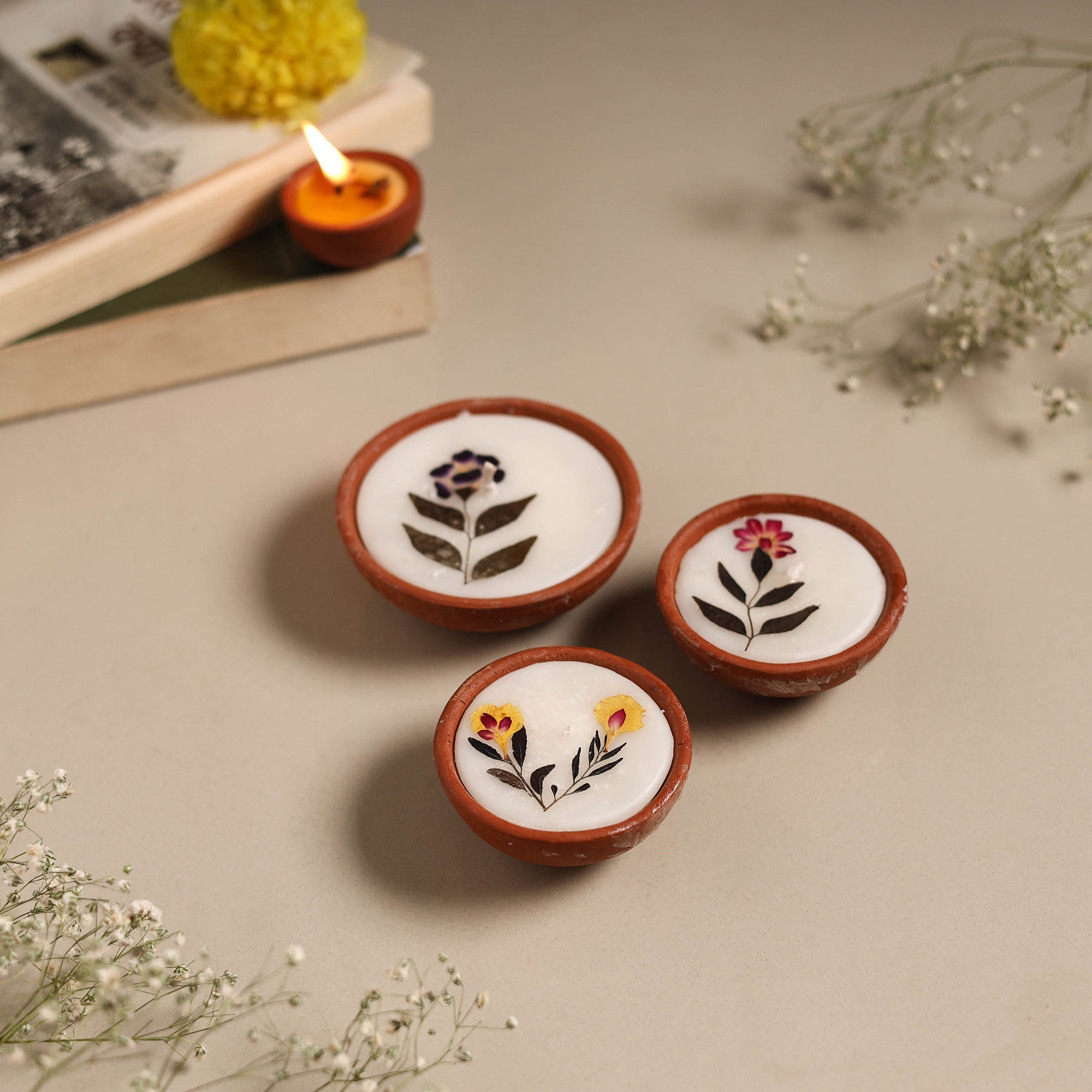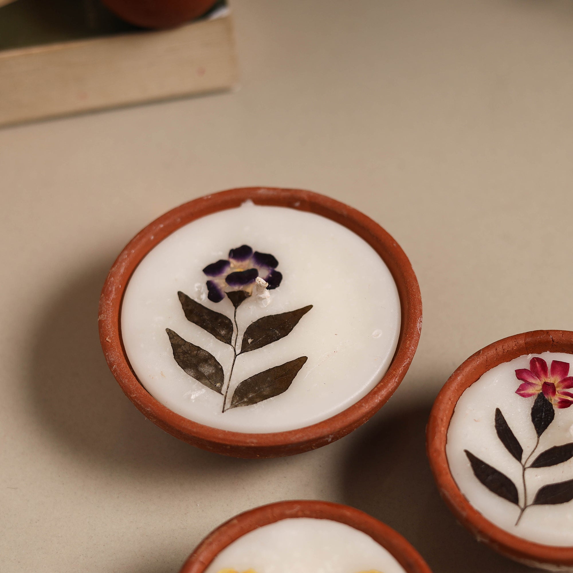 The sri aurobindo ashram clay diya with wax set is carefully hand-poured with attention to detail. Each diya features delicately pressed dried blooms on the clay surface, adding a natural touch of elegance. When lit together, these diyas create a soft, enchanting glow, making them ideal for peaceful decor and festive occasions.