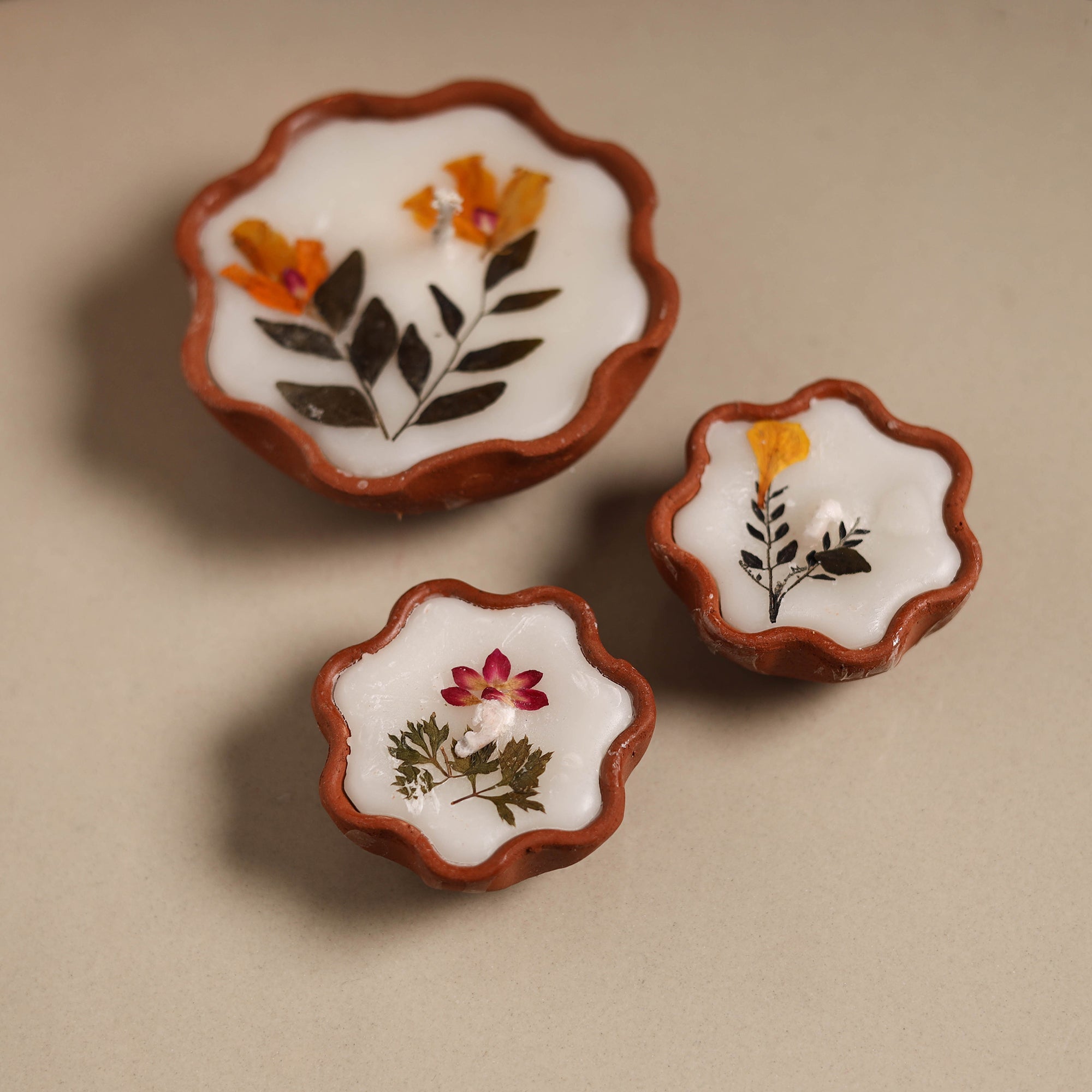 The sri aurobindo ashram clay diya with wax set is individually hand-poured with care. Each diya is adorned with delicately pressed dried blooms on the clay surface, exuding a touch of natural elegance. Together, these diyas radiate a soft, magical glow, making them perfect for serene decor and festive celebrations.