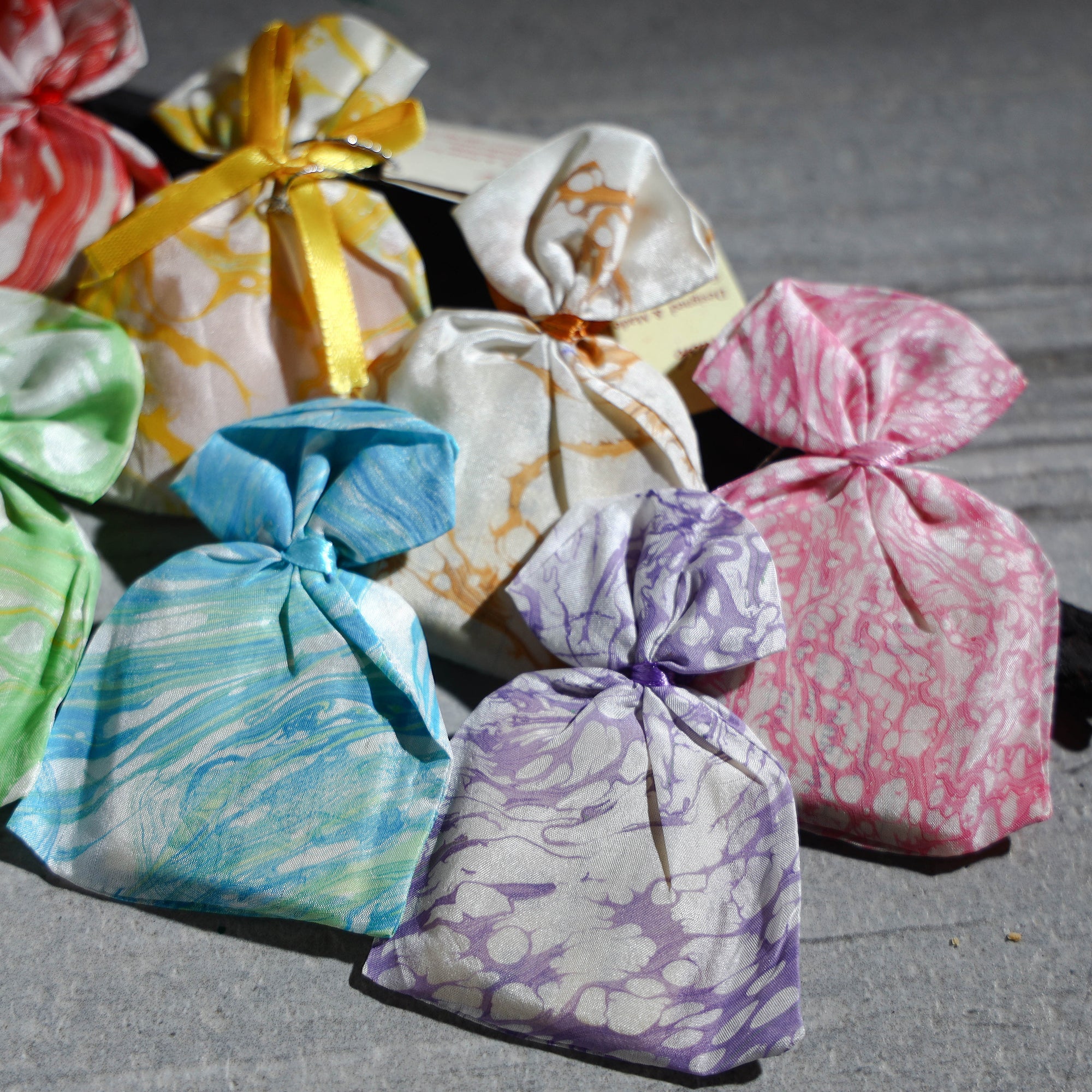 | Material | Perfumed sachet is made using fragrant herbs and essential oils, wrapped in 100% hand-marbled silk fabric. It can be used as a freshener and deodoriser without untying the ribbon.