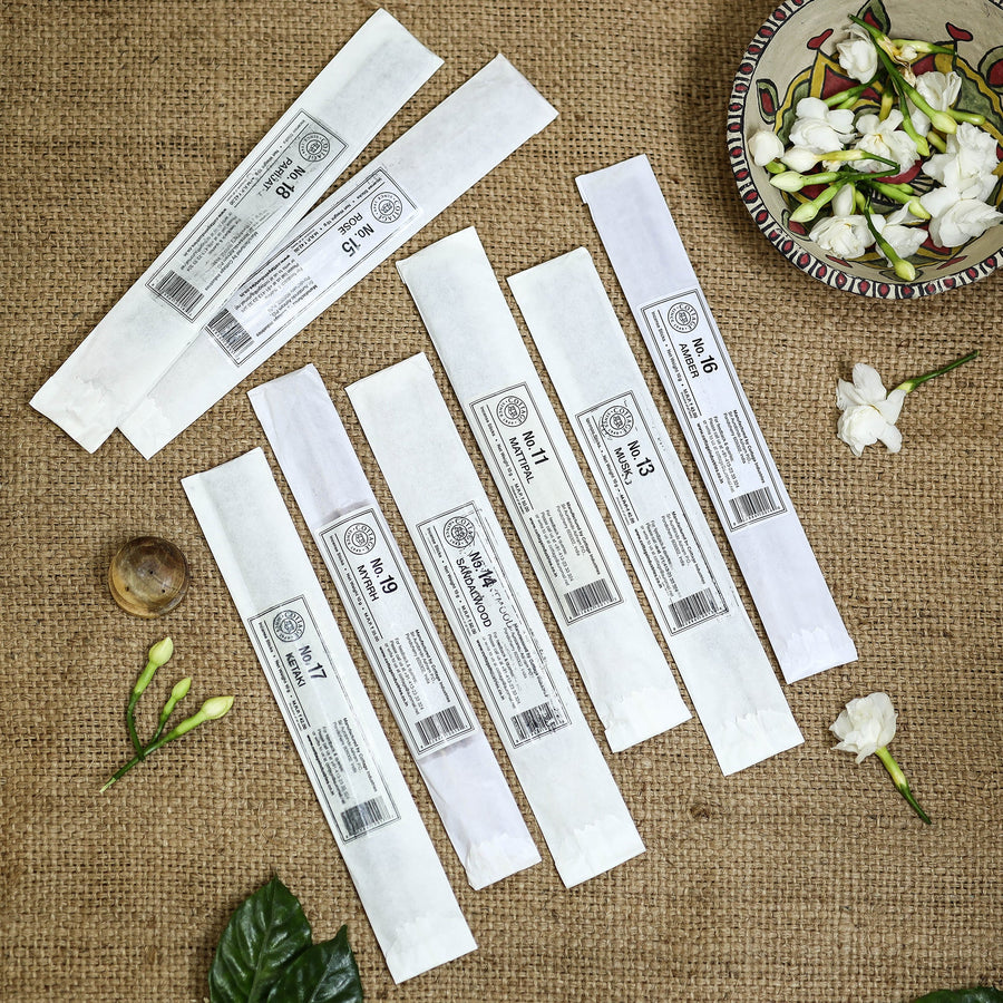 Naturally fragrant roots, barks, flower petals and a touch of essential oils, are mixed to form a fragrant base, called the 'masala'. Held together by honey or even jaggery, the 'masala' is hand-rolled on shredded bamboo and shaped into slim incense sticks, free of any artificial additives.