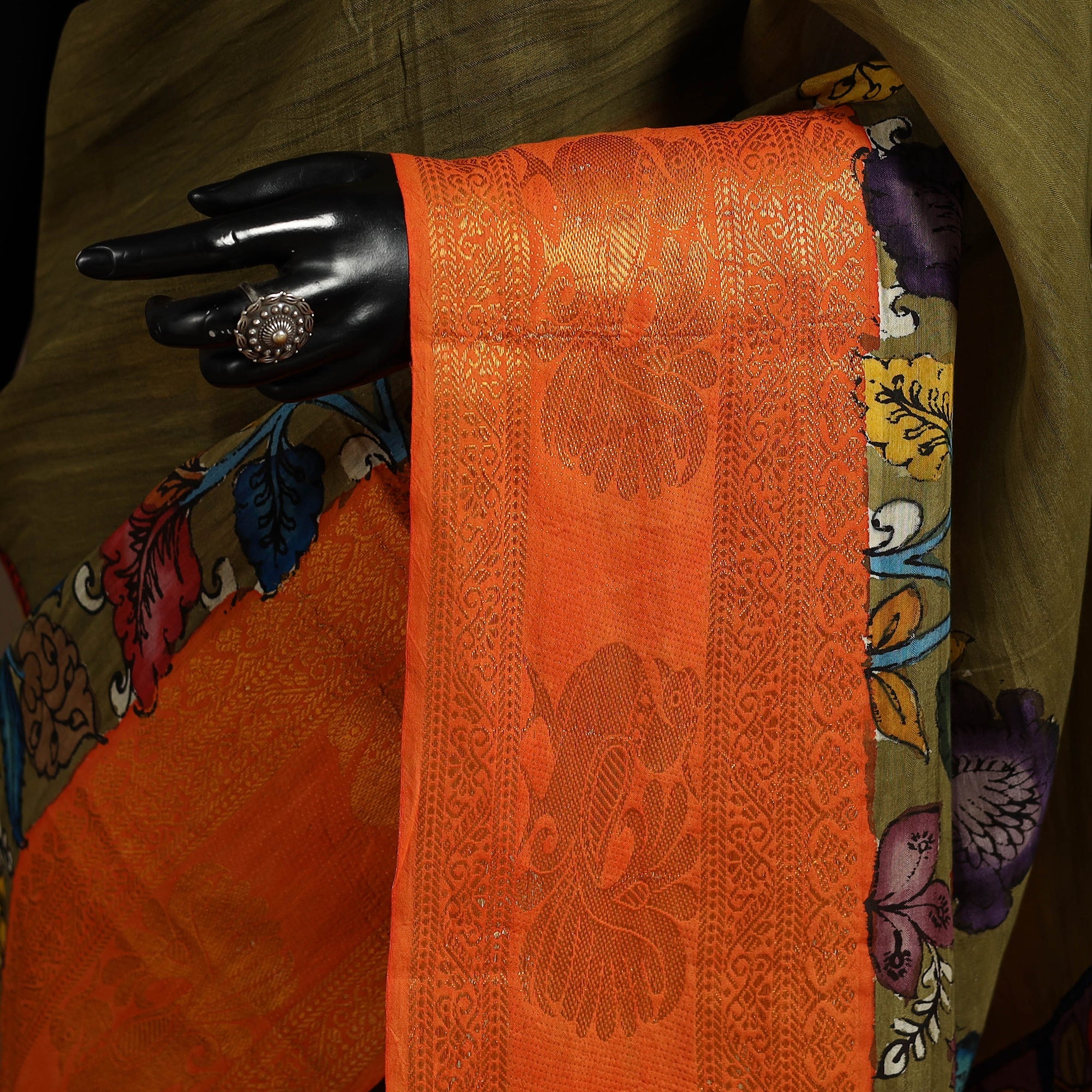 This fine-quality green srikalahasti pen work kalamkari handloom cotton saree, adorned with a zari border and tassels, is crafted with timeless artistry. In the traditional srikalahasti style, motifs are drawn freehand with a “kalam” and coloured using natural dyes. With a legacy of over 200 years, these age-old dyeing methods have been preserved through generations. Perfect for festive occasions, cultural gatherings, or elegant evenings, its hand-painted irregularities enhance authenticity.