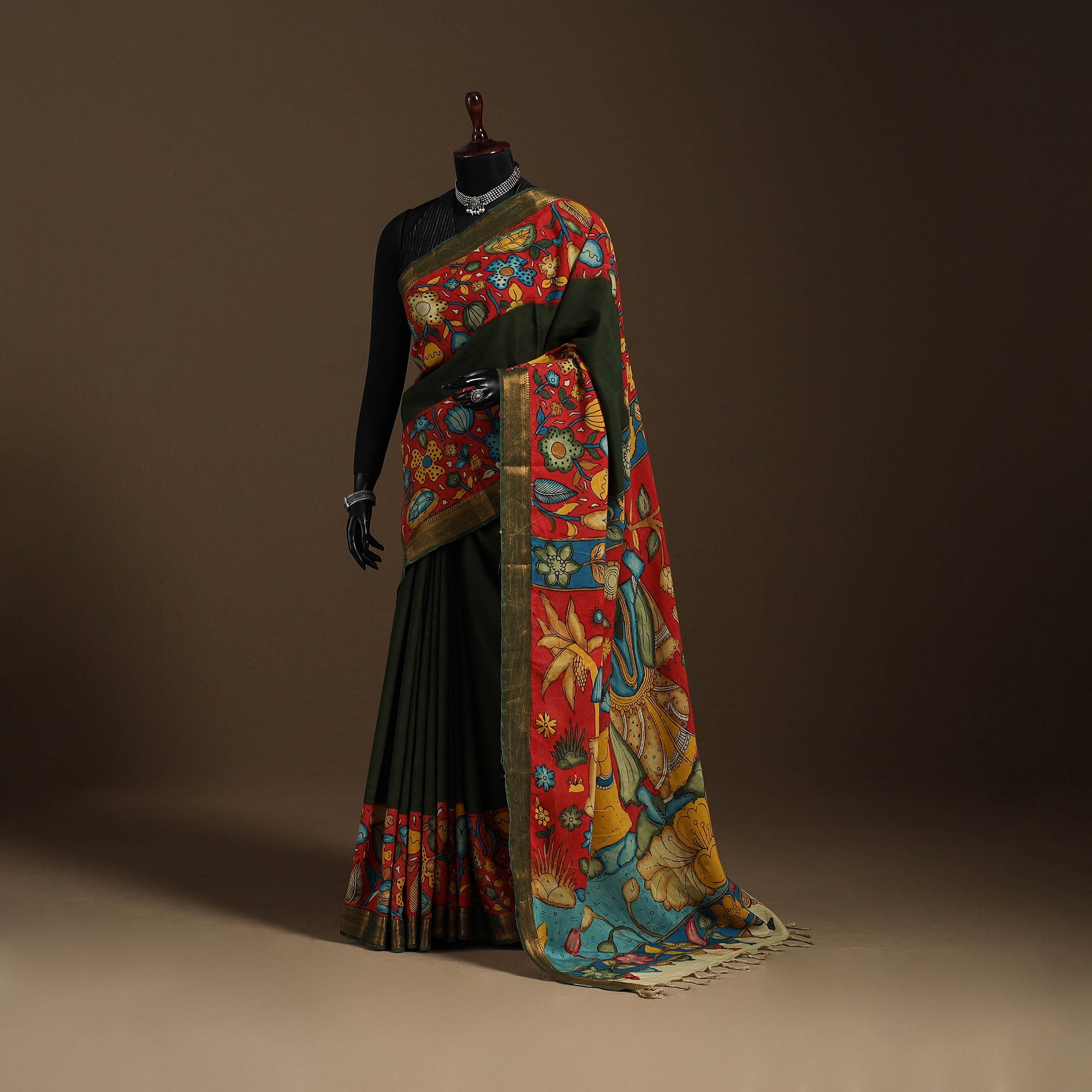 This fine-quality green srikalahasti pen work kalamkari handloom cotton saree, adorned with a zari border and tassels, is crafted with timeless artistry. In the traditional srikalahasti style, motifs are drawn freehand with a “kalam” and coloured using natural dyes. With a legacy of over 200 years, these age-old dyeing methods have been preserved through generations. Perfect for festive occasions, cultural gatherings, or elegant evenings, its hand-painted irregularities enhance authenticity.