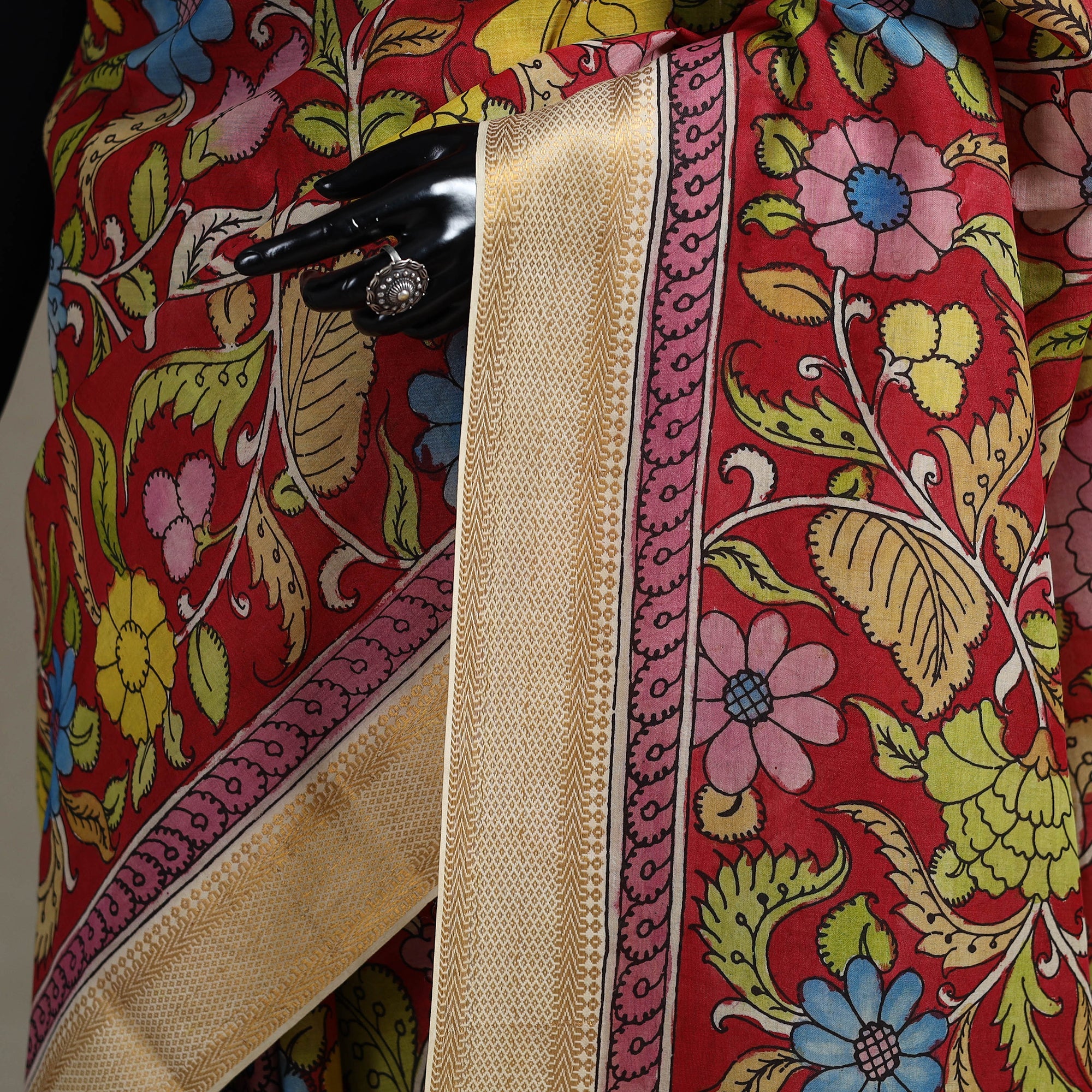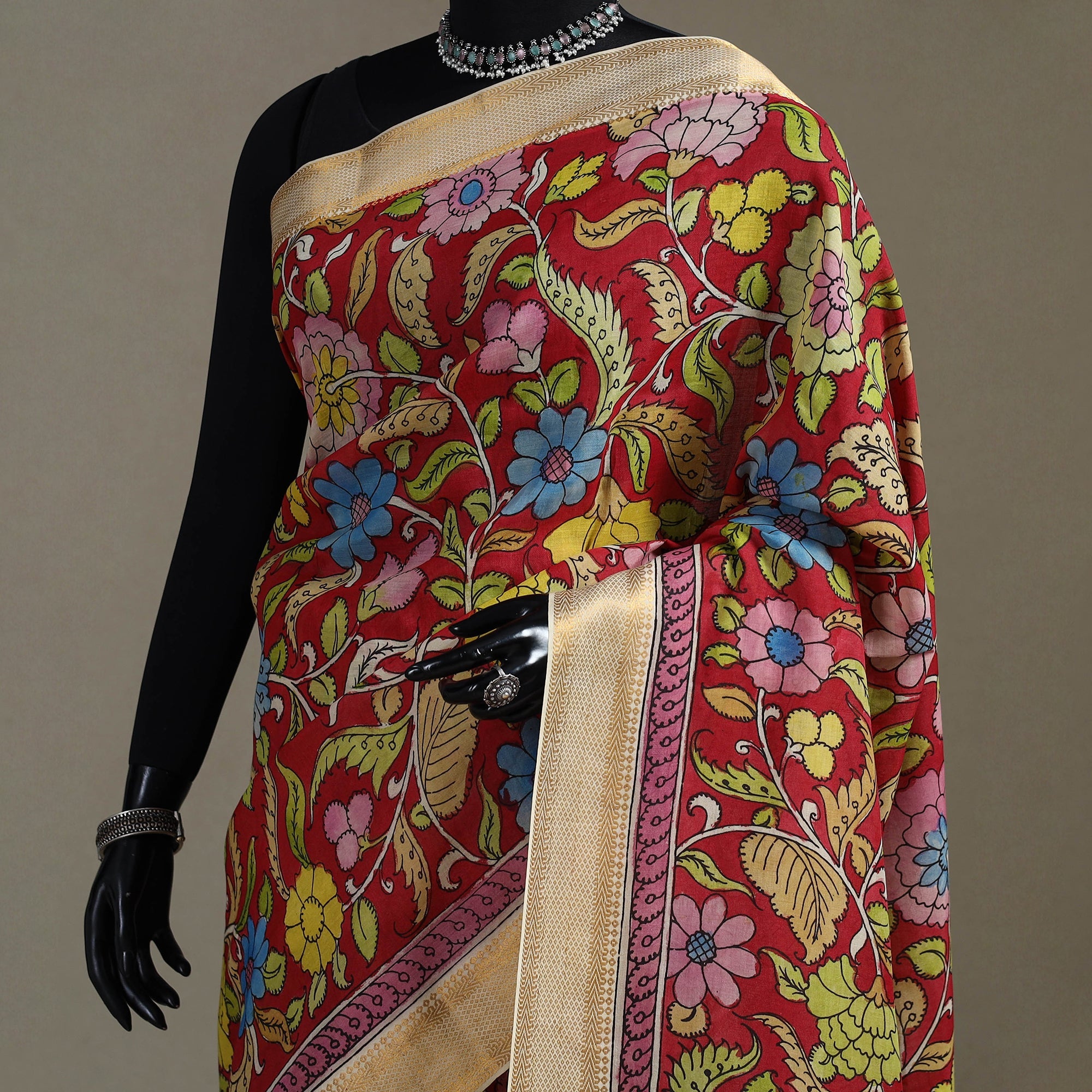 Bangalore silk saree showcases the srikalahasti style of kalamkari pen work with floral motifs and zari border by artist Yarasi Bhargavi. Known for its smooth texture it is entirely handpainted using natural dyes. The Srikalahasti technique involves freehand drawing with a kalam (pen) and filling in detailed motifs a tradition practiced for over 200 years. The saree is woven with 125’s art silk in the weft and 80’s cotton in the warp. Perfect for special events or unique wardrobe statements this saree reflects true artistry. This kalamkari saree carries a distinct natural odor.