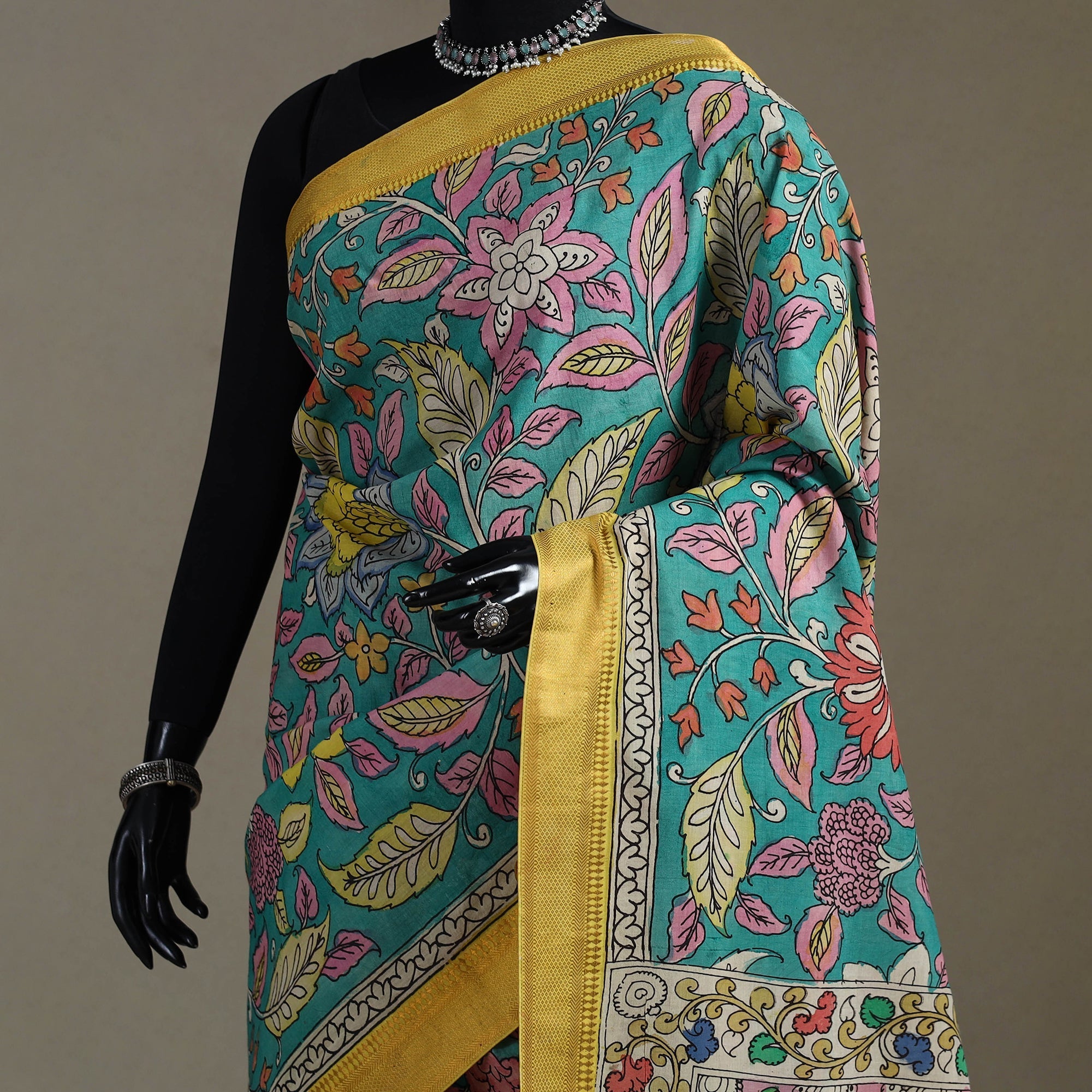 Green bangalore silk saree showcases the srikalahasti style of kalamkari pen work with floral motifs and zari border by artist Yarasi Bhargavi. Known for its smooth texture it is entirely handpainted using natural dyes. The Srikalahasti technique involves freehand drawing with a kalam (pen) and filling in detailed motifs a tradition practiced for over 200 years. The saree is woven with 125’s art silk in the weft and 80’s cotton in the warp. Perfect for special events or unique wardrobe statements this saree reflects true artistry. This kalamkari saree carries a distinct natural odor.