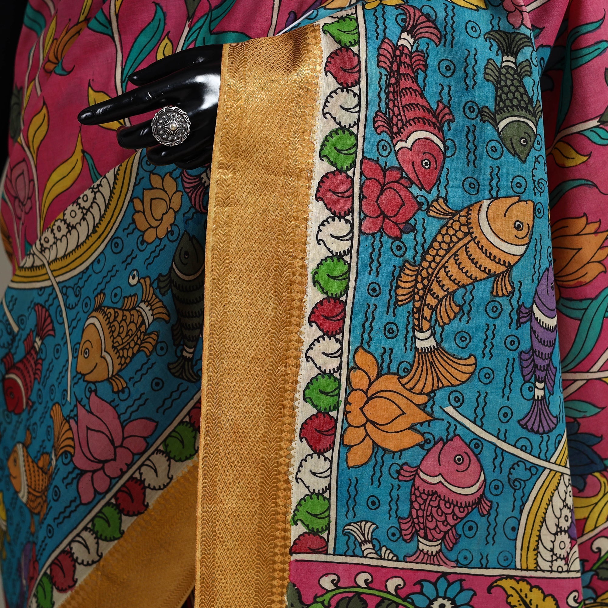 Pink bangalore silk saree showcases the srikalahasti style of kalamkari pen work with floral motifs and zari border by artist Yarasi Bhargavi. Known for its smooth texture it is entirely handpainted using natural dyes. The Srikalahasti technique involves freehand drawing with a kalam (pen) and filling in detailed motifs a tradition practiced for over 200 years. The saree is woven with 125’s art silk in the weft and 80’s cotton in the warp. Perfect for special events or unique wardrobe statements this saree reflects true artistry. This kalamkari saree carries a distinct natural odor.