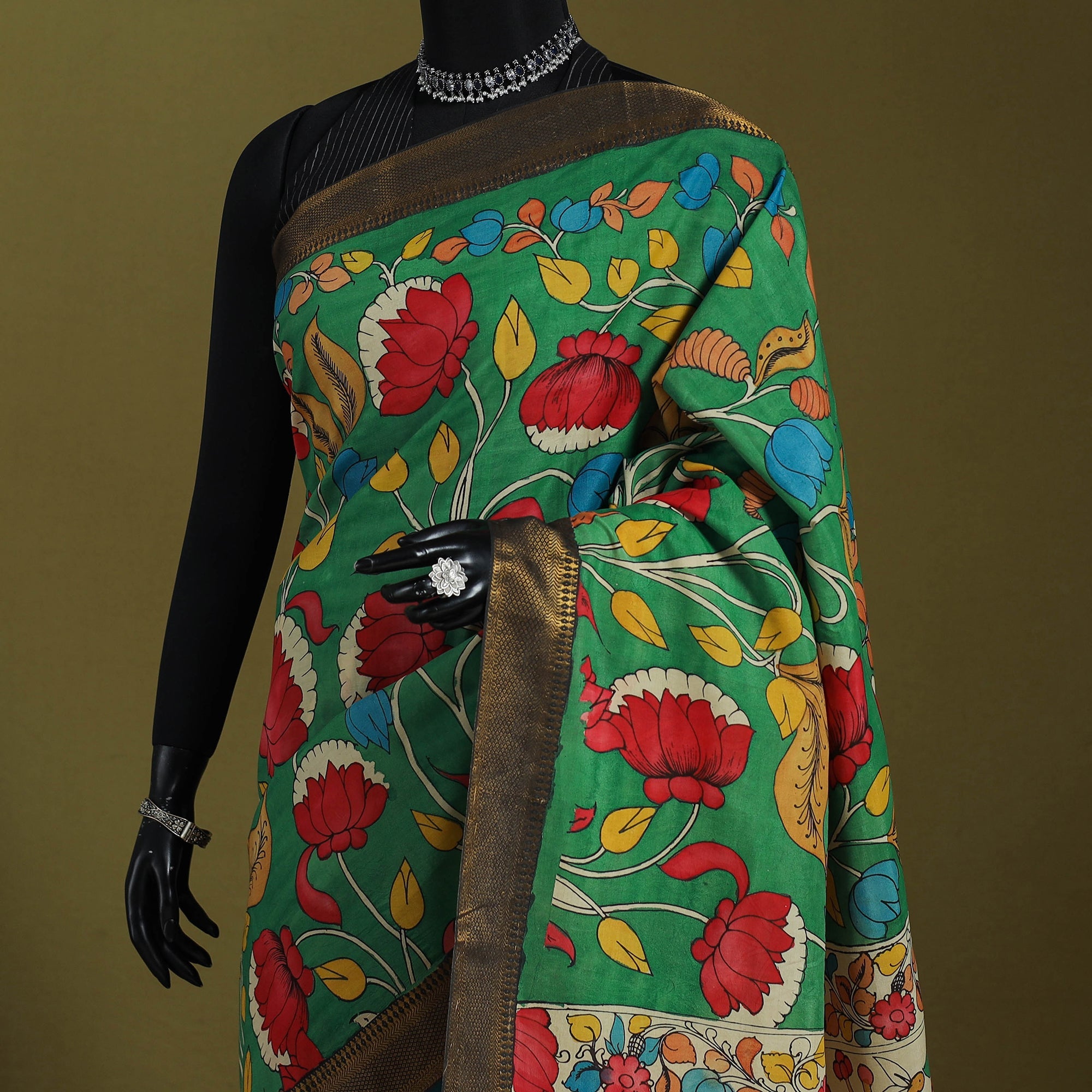 This green bangalore silk saree showcases the intricate srikalahasti style of kalamkari pen work with delicate floral motifs and a subtle zari border. Known for its smooth texture and elegant drape, it is entirely hand-painted using natural dyes, which bring out rich, vibrant colors. The Srikalahasti technique involves freehand drawing with a kalam (pen) and filling in detailed motifs, a tradition practiced for over 200 years. Perfect for festive occasions, special events, or unique wardrobe statements, this saree reflects true artistry. This kalamkari saree carries a distinct natural odor.