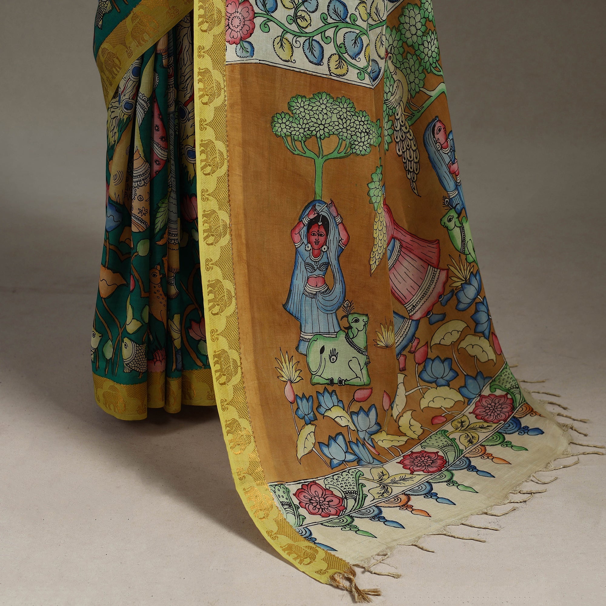Green bangalore silk saree showcases the srikalahasti style of kalamkari pen work with figure motifs and zari border by artist Yarasi Bhargavi. Known for its smooth texture it is entirely handpainted using natural dyes. The Srikalahasti technique involves freehand drawing with a kalam (pen) and filling in detailed motifs a tradition practiced for over 200 years. The saree is woven with 125’s art silk in the weft and 80’s cotton in the warp. Perfect for special events or unique wardrobe statements this saree reflects true artistry. This kalamkari saree carries a distinct natural odor.