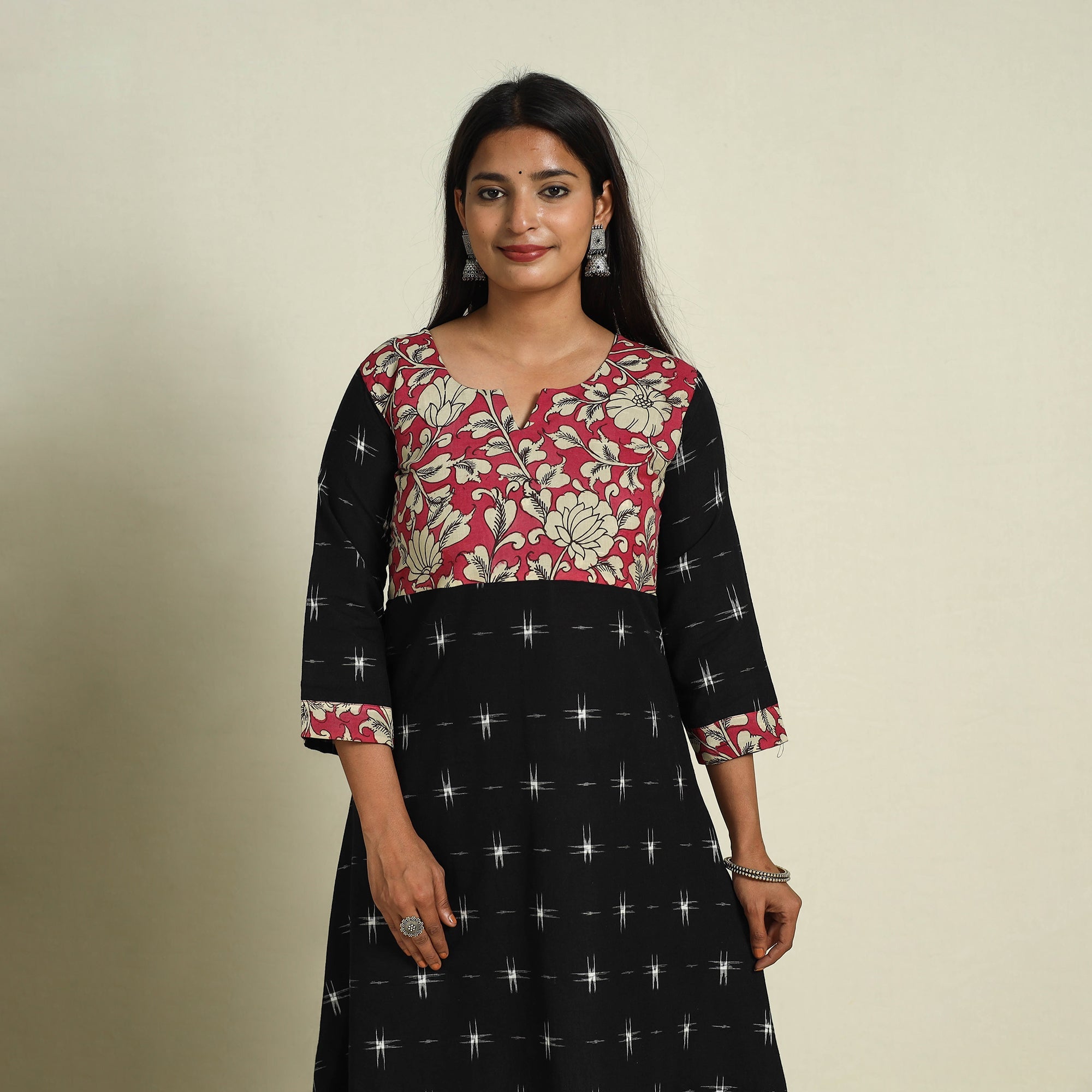 A perfect blend of tradition and contemporary fashion, this black srikalahasti kalamkari mosaic fusion cotton a-line pochampally Ikat kurta redefines ethnic wear. Crafted by skilled artisans, it showcases intricate Ikat patterns. Made from breathable cotton, this kurta features a stylish side pocket, combining elegance with convenience.