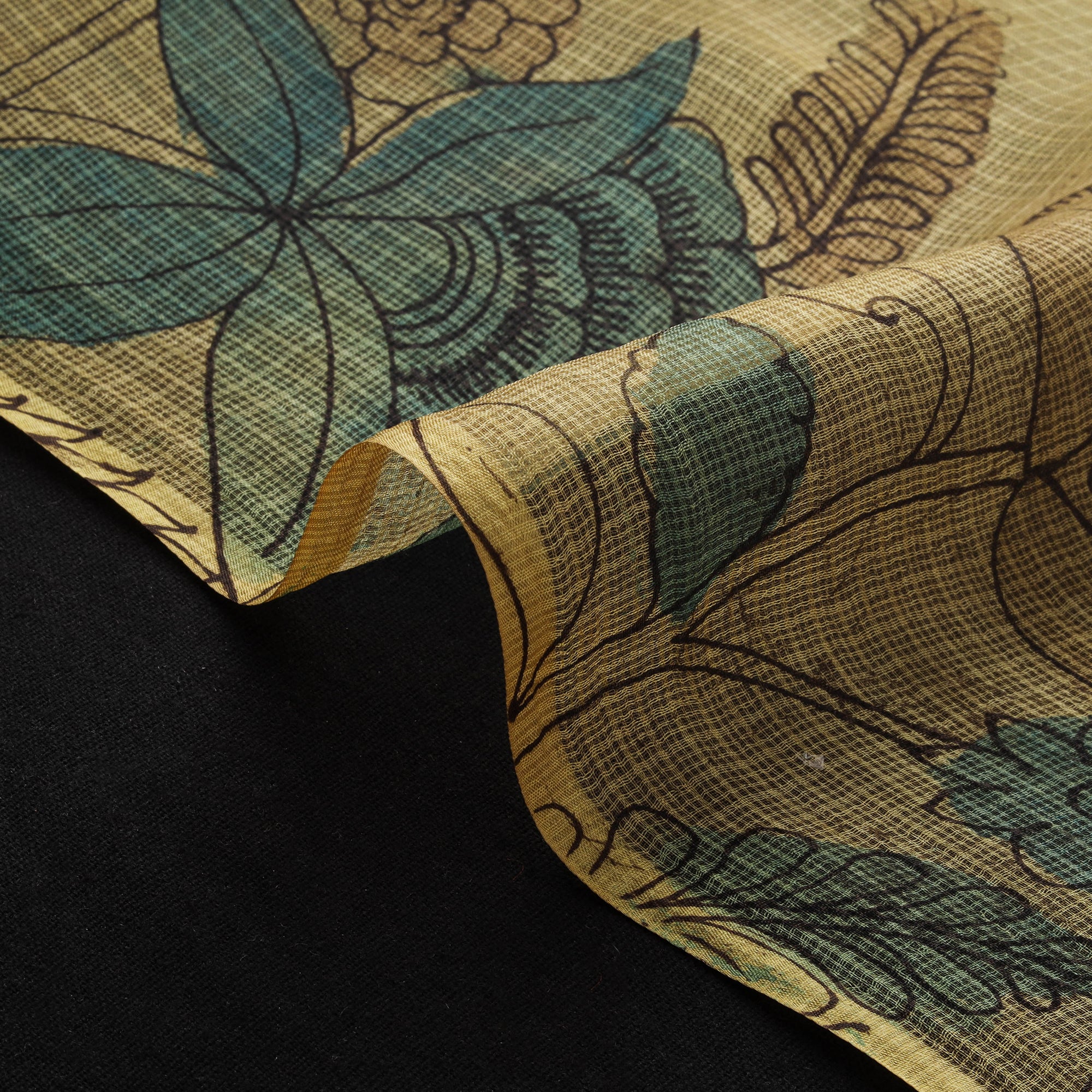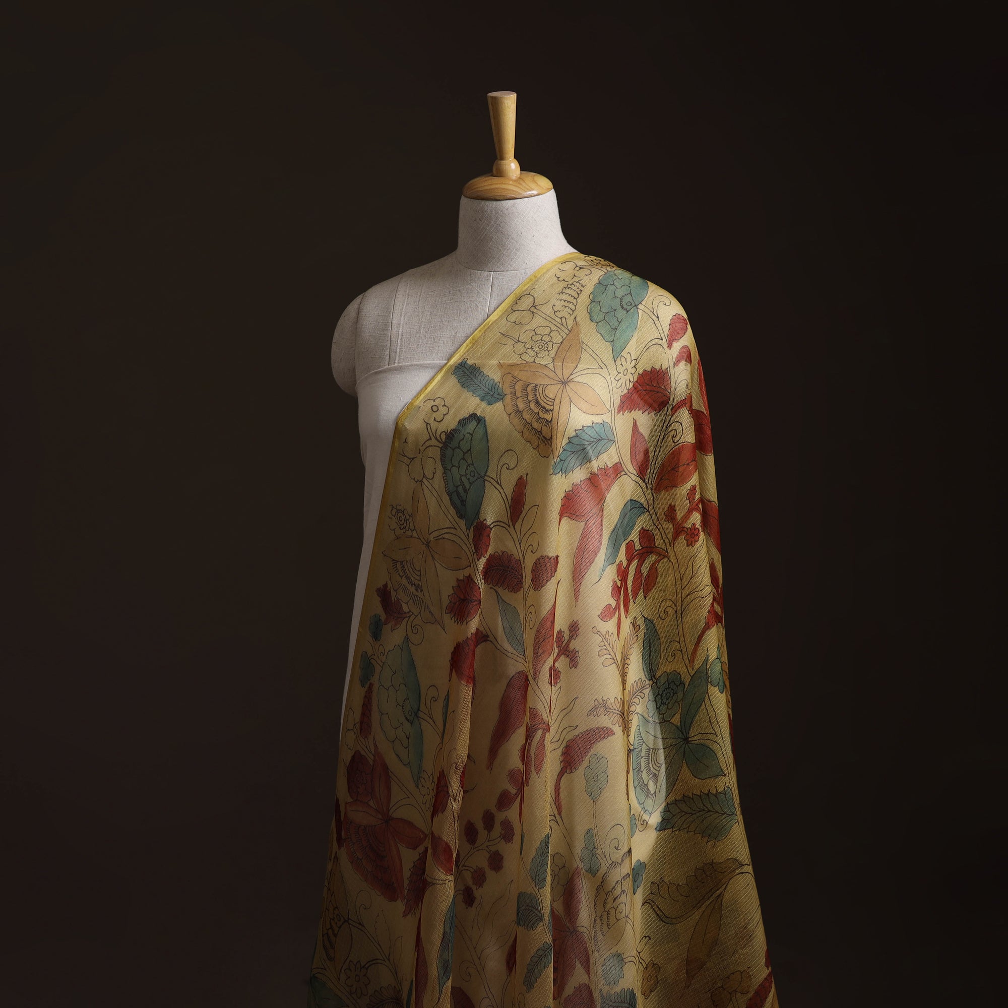 Pure handloom kota doria silk fabric showcases the intricate srikalahasti style of kalamkari pen work by master artisan Viswanath Reddy. Kalamkari is derived from ‘Kalam’ which means ‘Pen’ and ‘Kari’ which refers to craftsmanship. The kalamkari art depicts epic tales from hindu mythology. It also includes floral motifs, animal forms and village backgrounds. The srikalahasti style involves freehand drawing with a kalam (pen) and filling in natural colors, a tradition practiced for thousands of years. Kota doria is an age-old Indian textile produced in the Kota district of Rajasthan. The doria or the threads are finely interweaves to make the check patterns. Its lightweight and sheer texture giving an exquisite grace and elegance of its own. Ideal for designing clothing, festive wear or unique decor accents, this kalamkari fabric carries a distinct natural odor. As it is hand-painted, slight color spread or irregularities in design are common and should not be considered as defects.