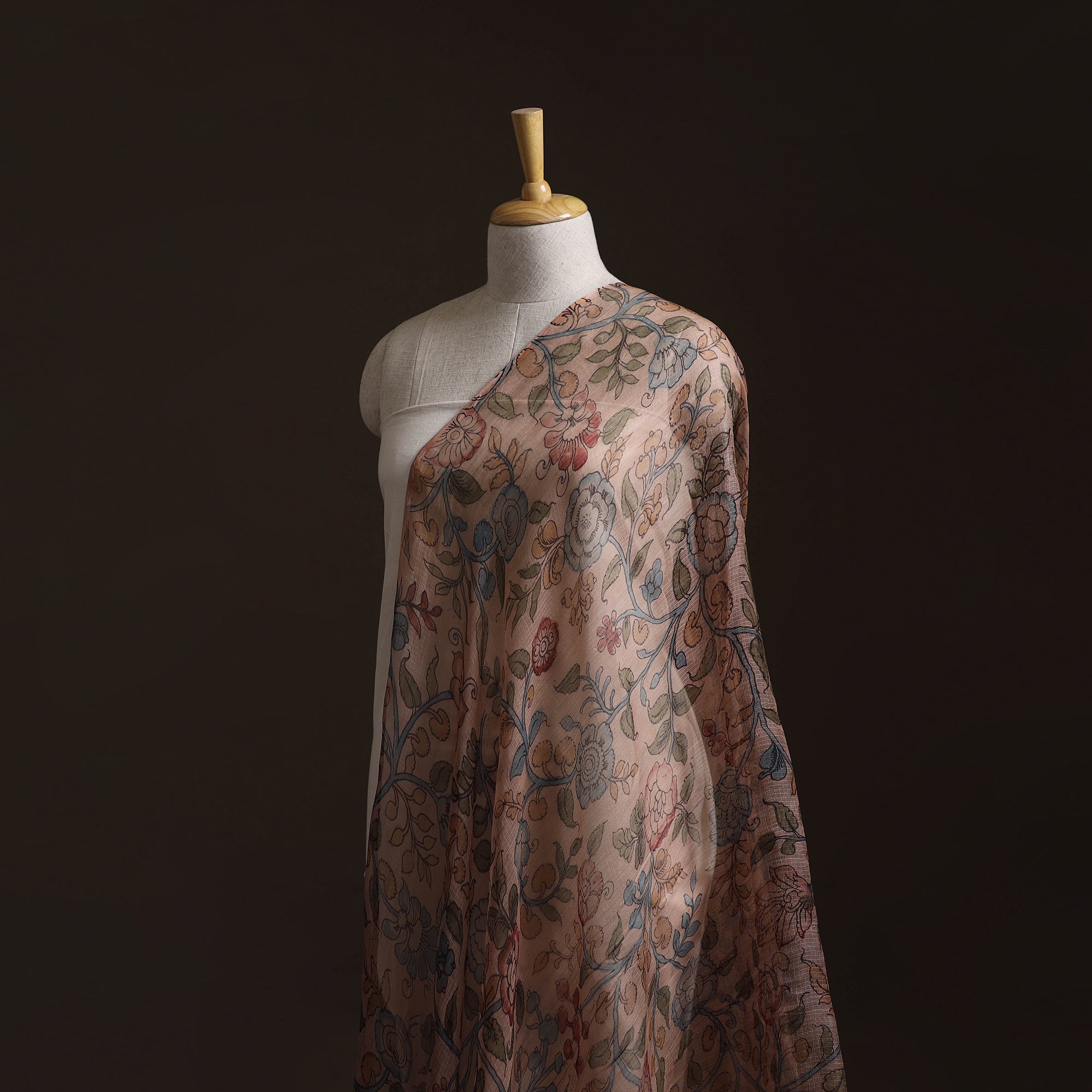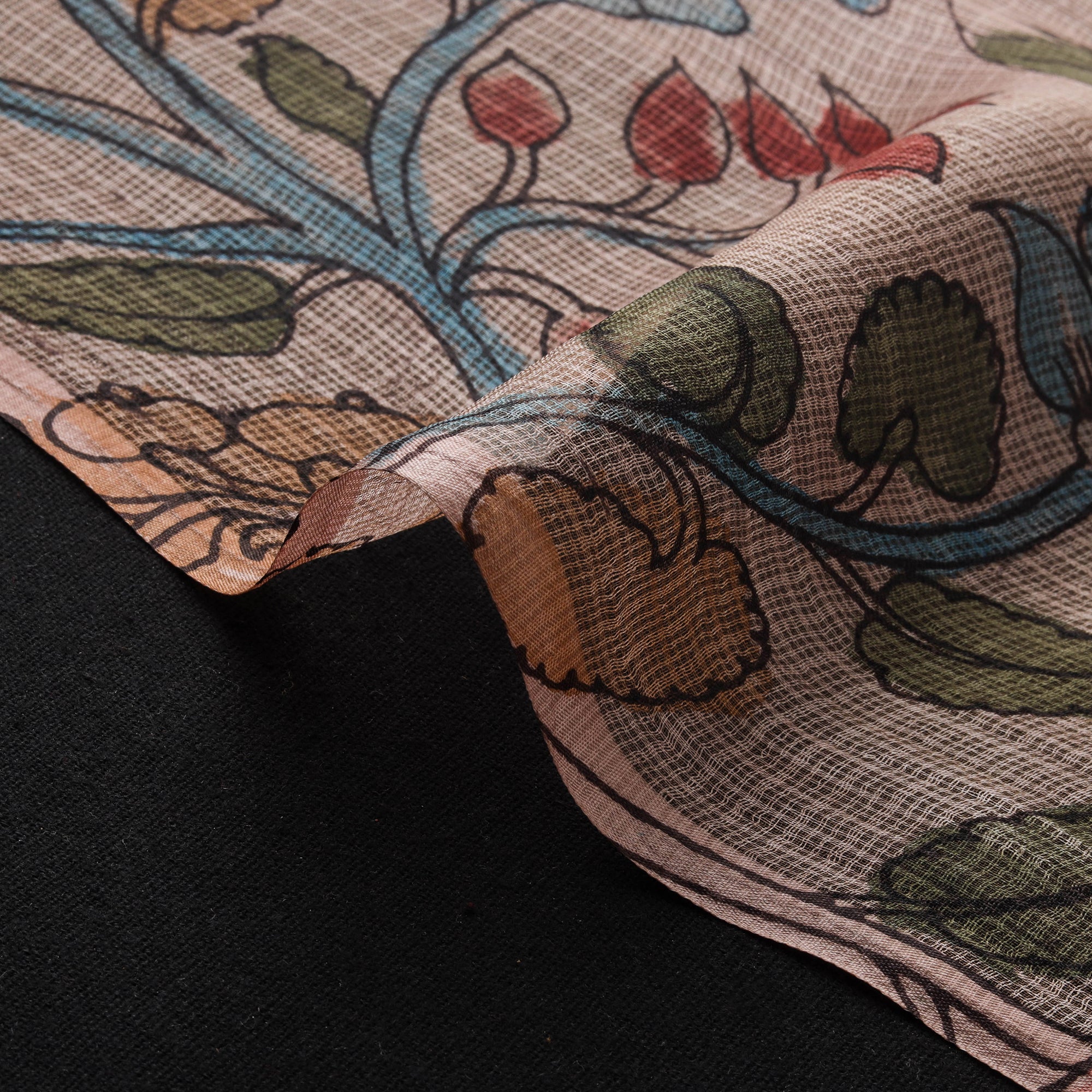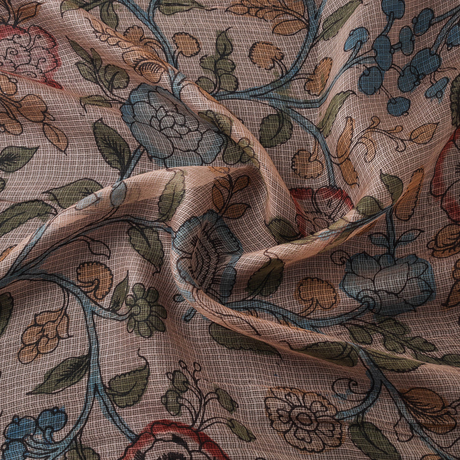 Pure handloom kota doria silk fabric showcases the intricate srikalahasti style of kalamkari pen work by master artisan Viswanath Reddy. Kalamkari is derived from ‘Kalam’ which means ‘Pen’ and ‘Kari’ which refers to craftsmanship. The kalamkari art depicts epic tales from hindu mythology. It also includes floral motifs, animal forms and village backgrounds. The srikalahasti style involves freehand drawing with a kalam (pen) and filling in natural colors, a tradition practiced for thousands of years. Kota doria is an age-old Indian textile produced in the Kota district of Rajasthan. The doria or the threads are finely interweaves to make the check patterns. Its lightweight and sheer texture giving an exquisite grace and elegance of its own. Ideal for designing clothing, festive wear or unique decor accents, this kalamkari fabric carries a distinct natural odor. As it is hand-painted, slight color spread or irregularities in design are common and should not be considered as defects.