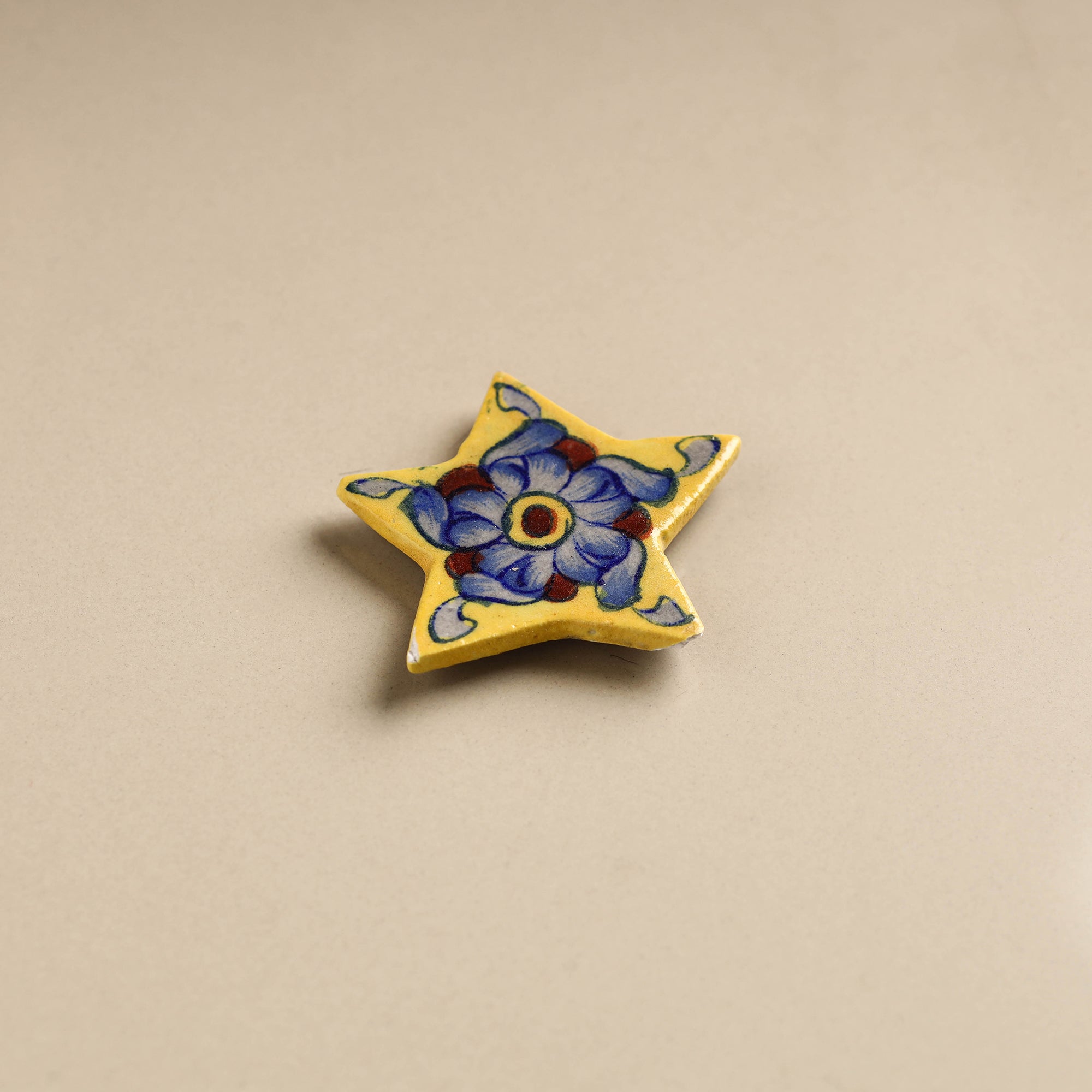 This original blue pottery ceramic tile yellow star fridge magnet is handmade in Jaipur. This traditional craft, known for its vivid blue hues, is created using a unique clay-free mixture of quartz stone powder, powdered glass, Multani Mitti (Fuller's Earth), borax, gum and water. Blue pottery is widely recognized as a traditional craft of Jaipur, though it is Turko-Persian in origin. This magnet is perfect for home decor or gifting.