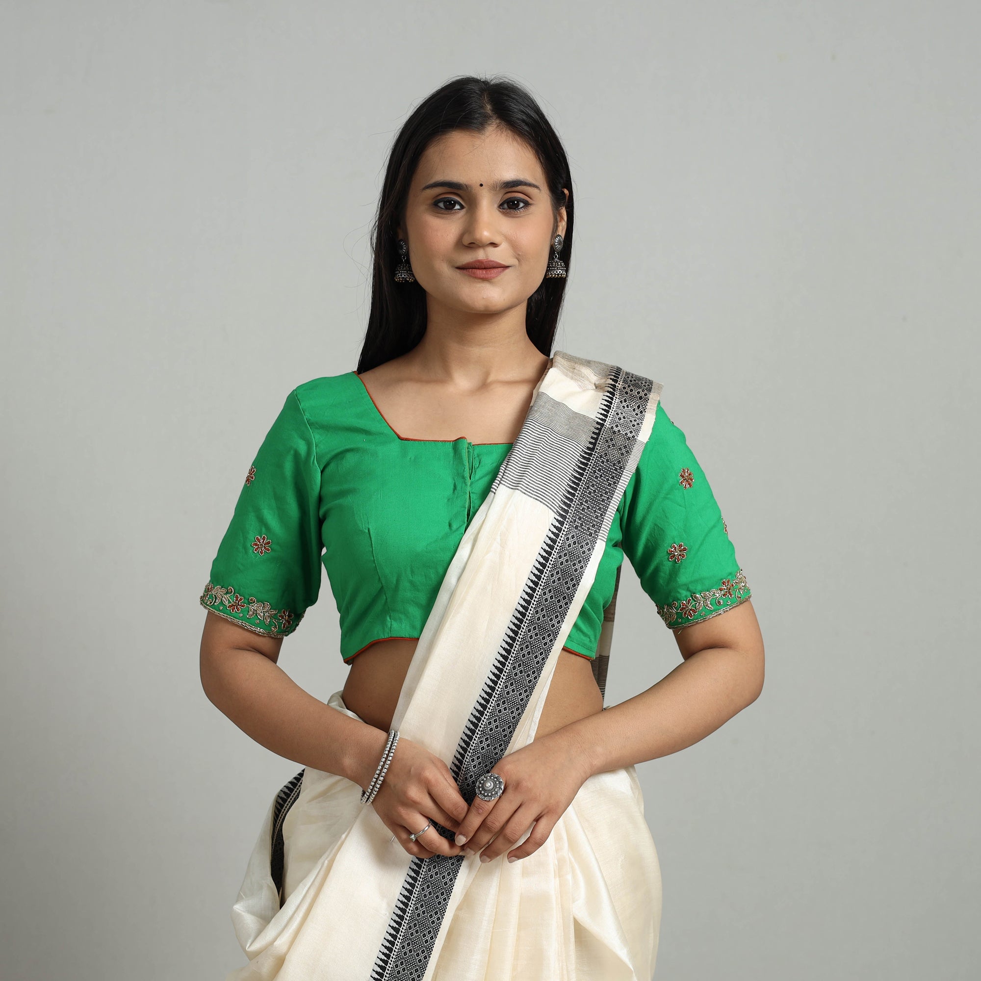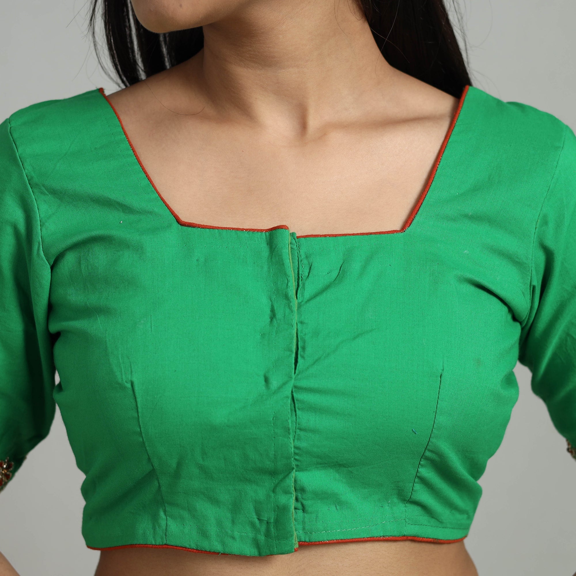 This green zardozi hand embroidery cotton blouse combines traditional craftsmanship with modern comfort. The breathable cotton ensures a relaxed fit, while the intricate zardozi embroidery adds a touch of elegance. Featuring half sleeves and a convenient hook lock, this stitched blouse is perfect for both casual and festive occasions.