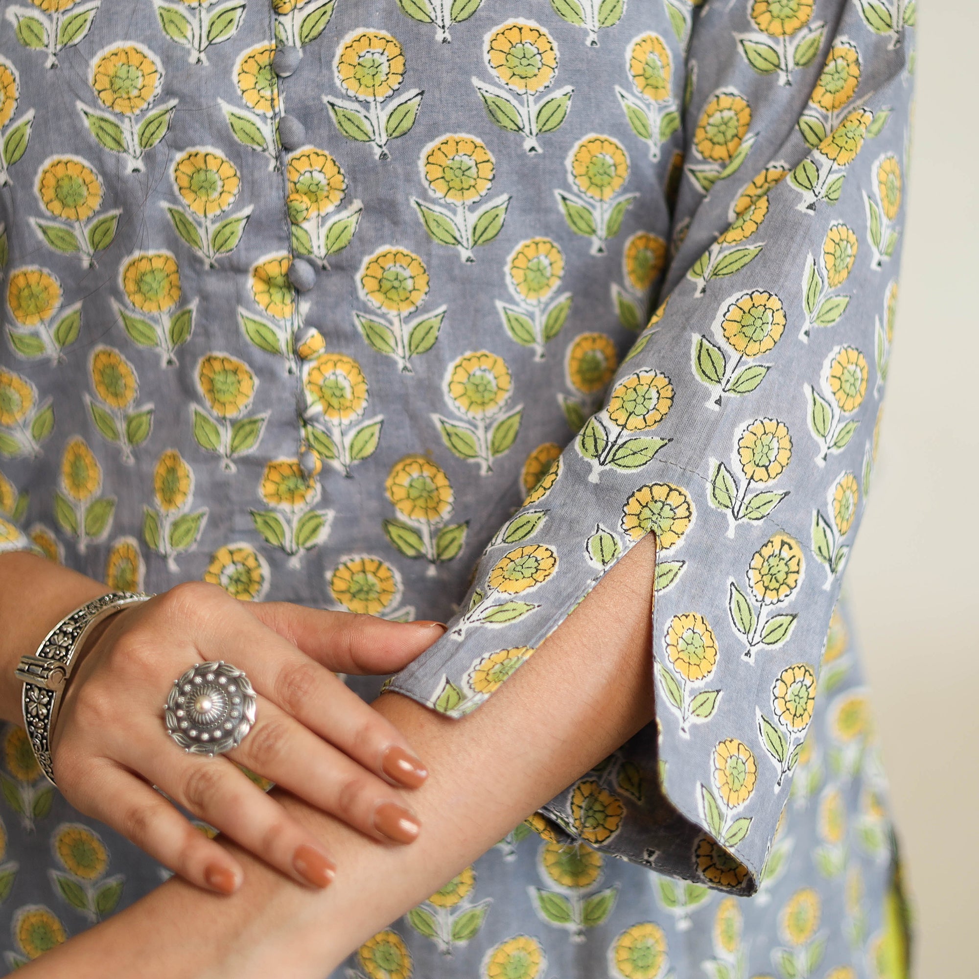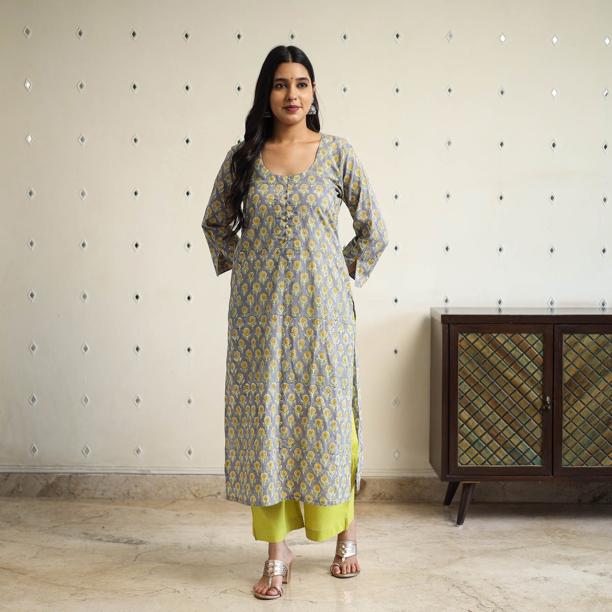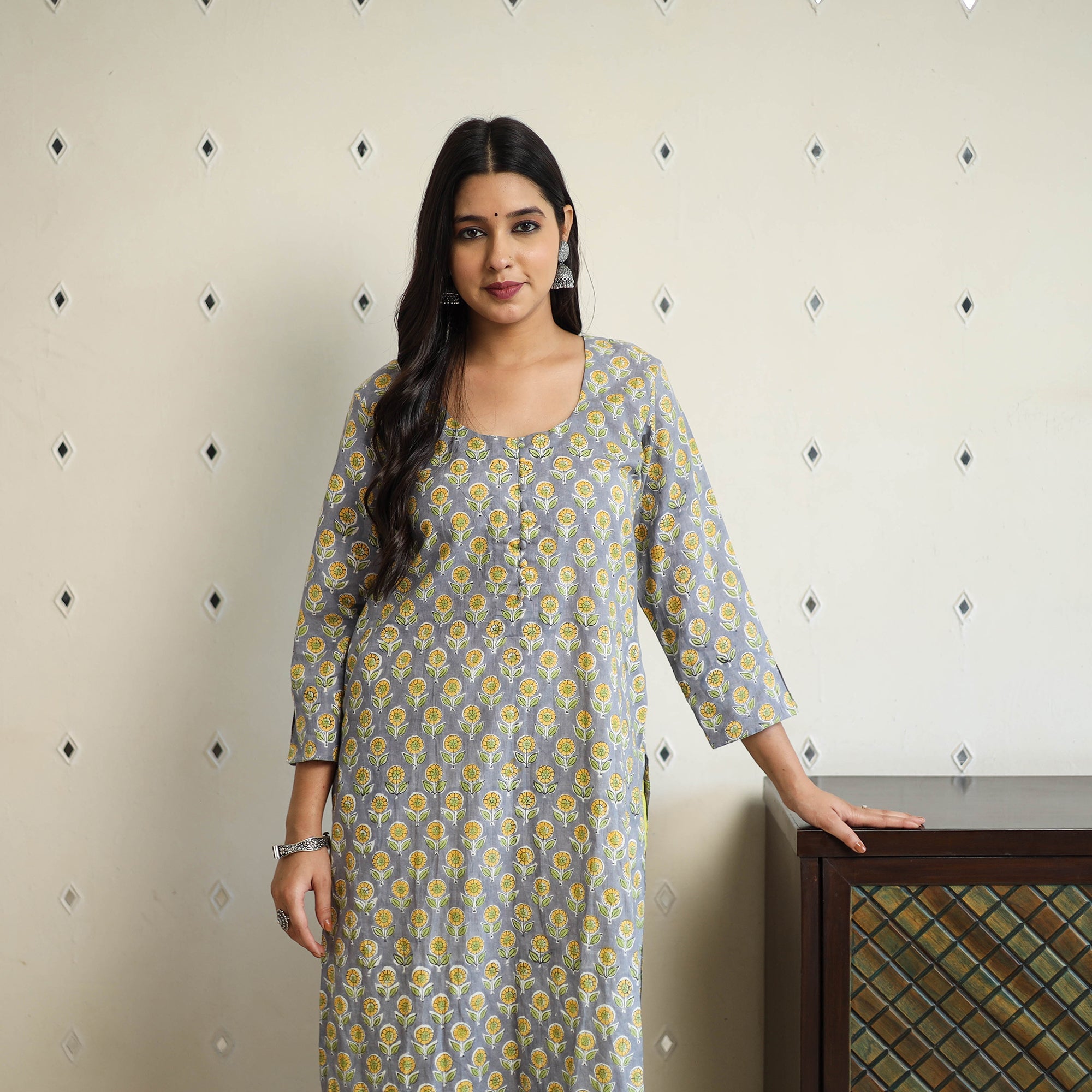 Step into timeless elegance with this grey sanganeri cotton straight kurta, adorned with delicate hand block prints. Featuring a handy side pocket, this kurta offers comfort along with classic beauty. Meticulously crafted by artisans, the sanganeri technique adds a refreshing touch to both daily dressing and festive occasions.