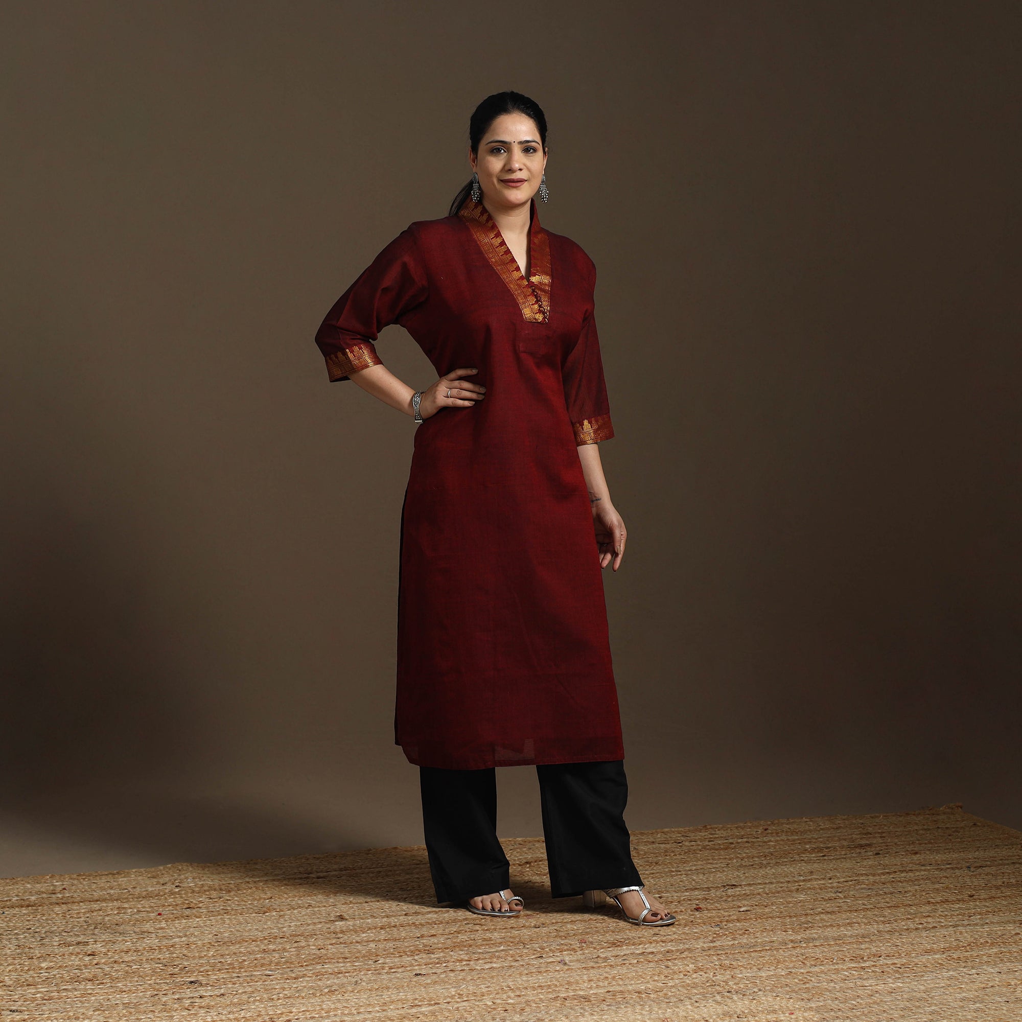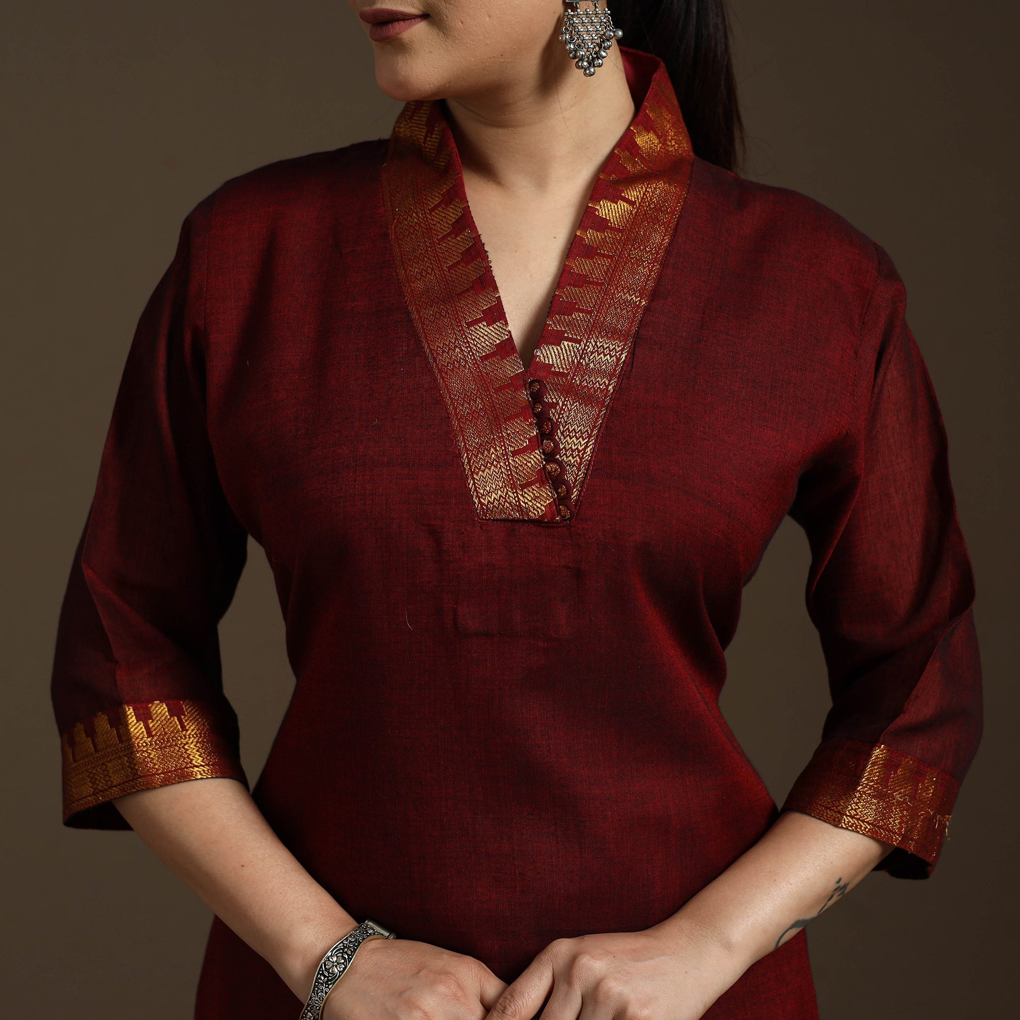This elegant maroon dharwad kurta showcases Karnataka’s traditional weaving charm. Designed in a straight-cut silhouette, it features a beautifully woven border on the front neck and sleeves, along with a convenient side pocket for ease. The cotton kurta offers a soft texture and comfortable fit, perfect for casual or festive wear. A simple yet graceful outfit that blends culture with everyday style.